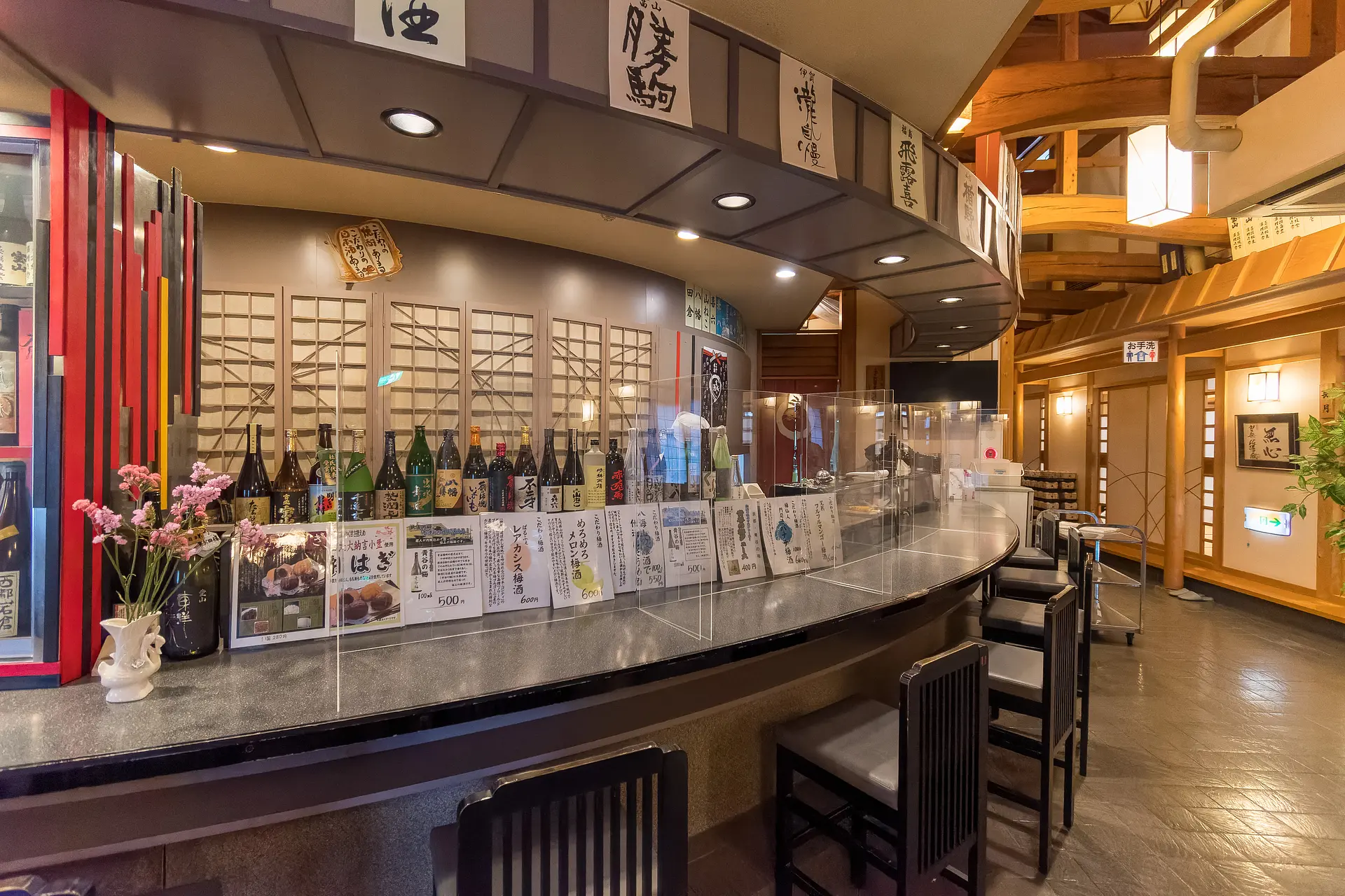 お酒の並ぶカウンター(感染対策中で現在は使用不可)と、座敷には足に優しい椅子席と掘りコタツ席が用意されています。