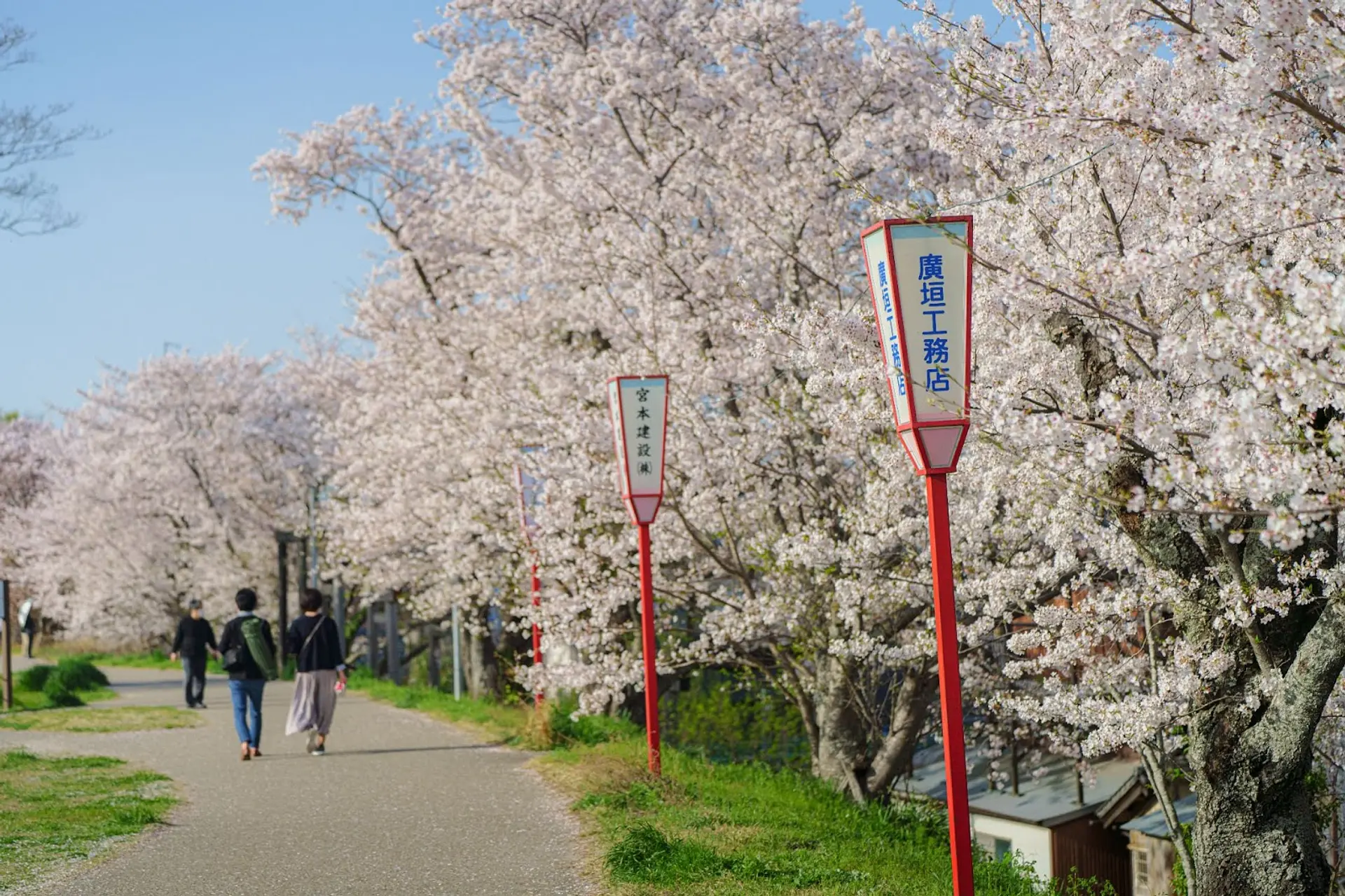 堤防の道路沿いにはレトロな行灯が建ち並び、ノスタルジーな雰囲気が漂います。
