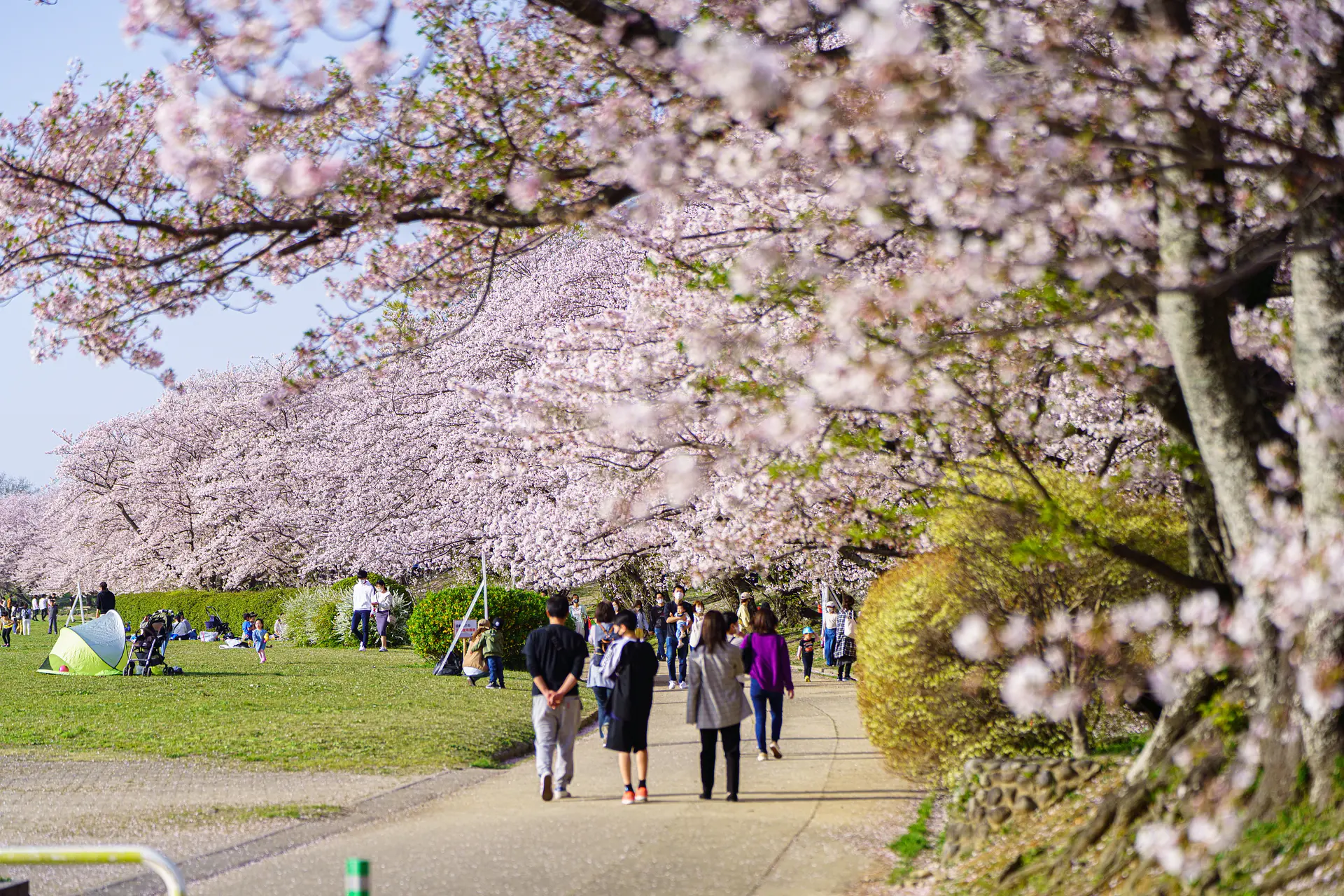 桜並木の中へ入ると、空が見えないほど咲き誇る光景に圧倒されます。