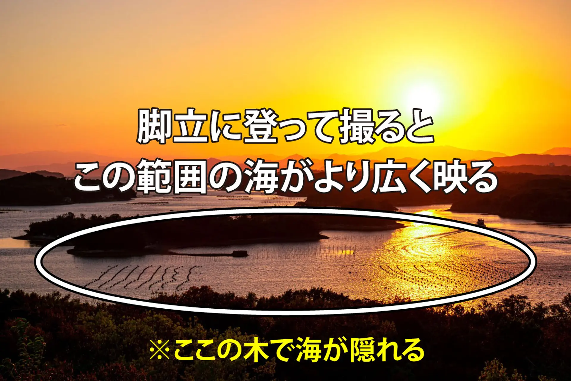 なぜかと言うと、手前の木々で海の一部が隠れるので、脚立に登って撮ると海をより広く映すことが出来るんです。