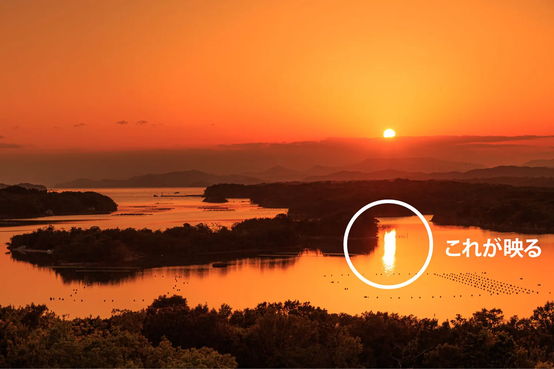 1月〜2月は展望台から見える中央の小島の左側に陽が落ちます。