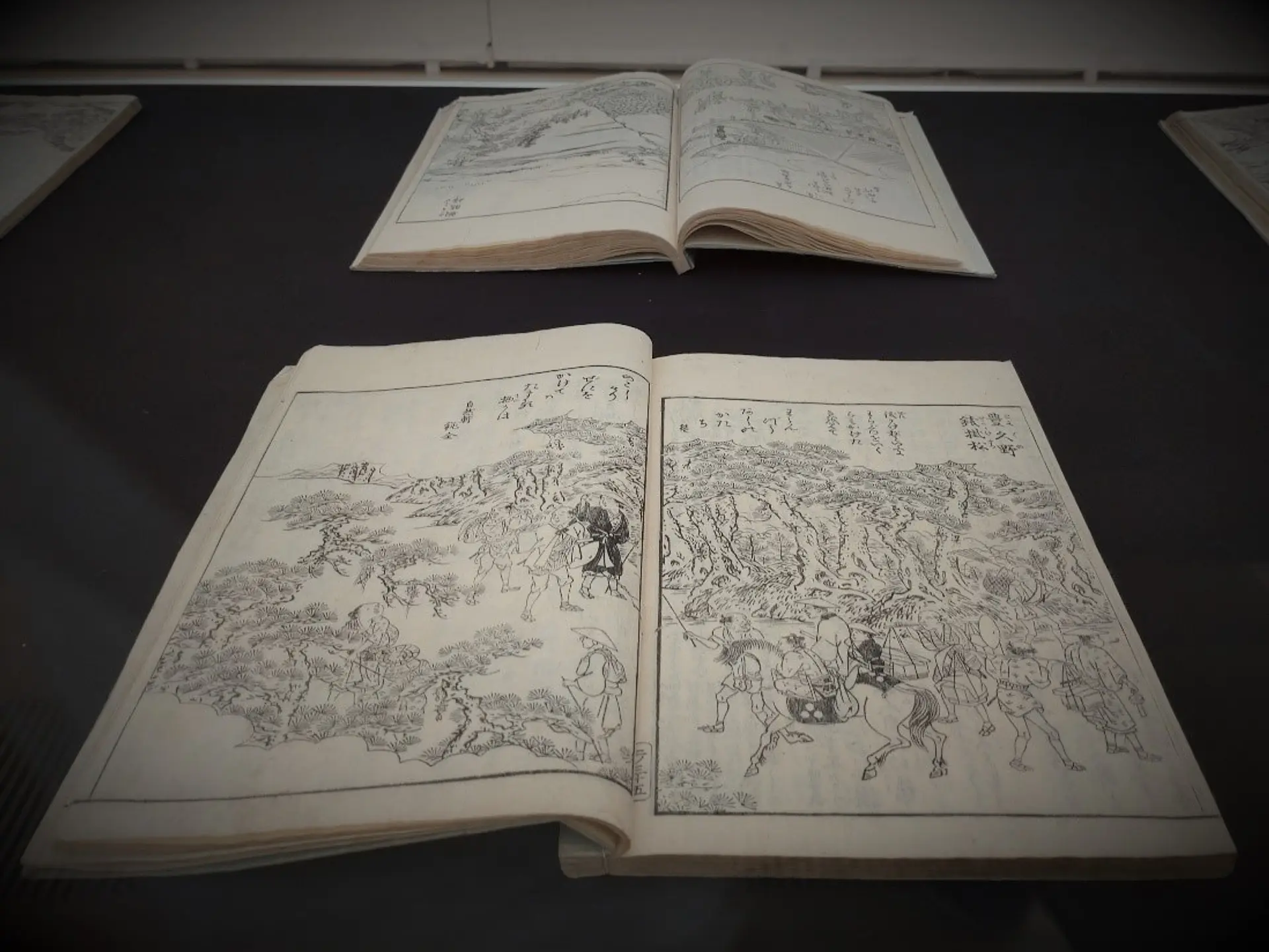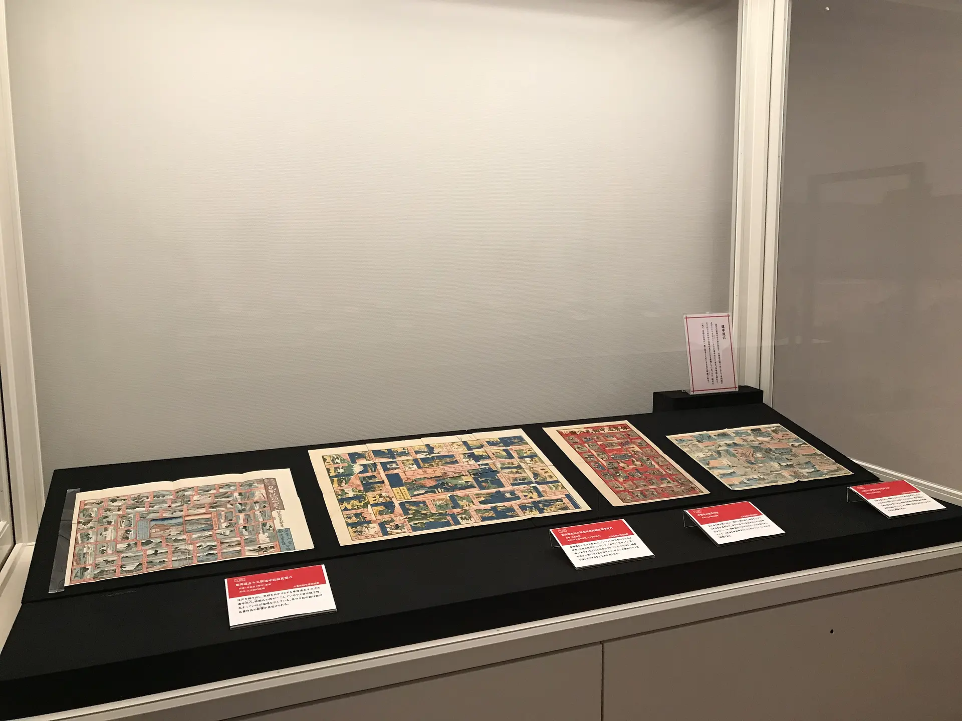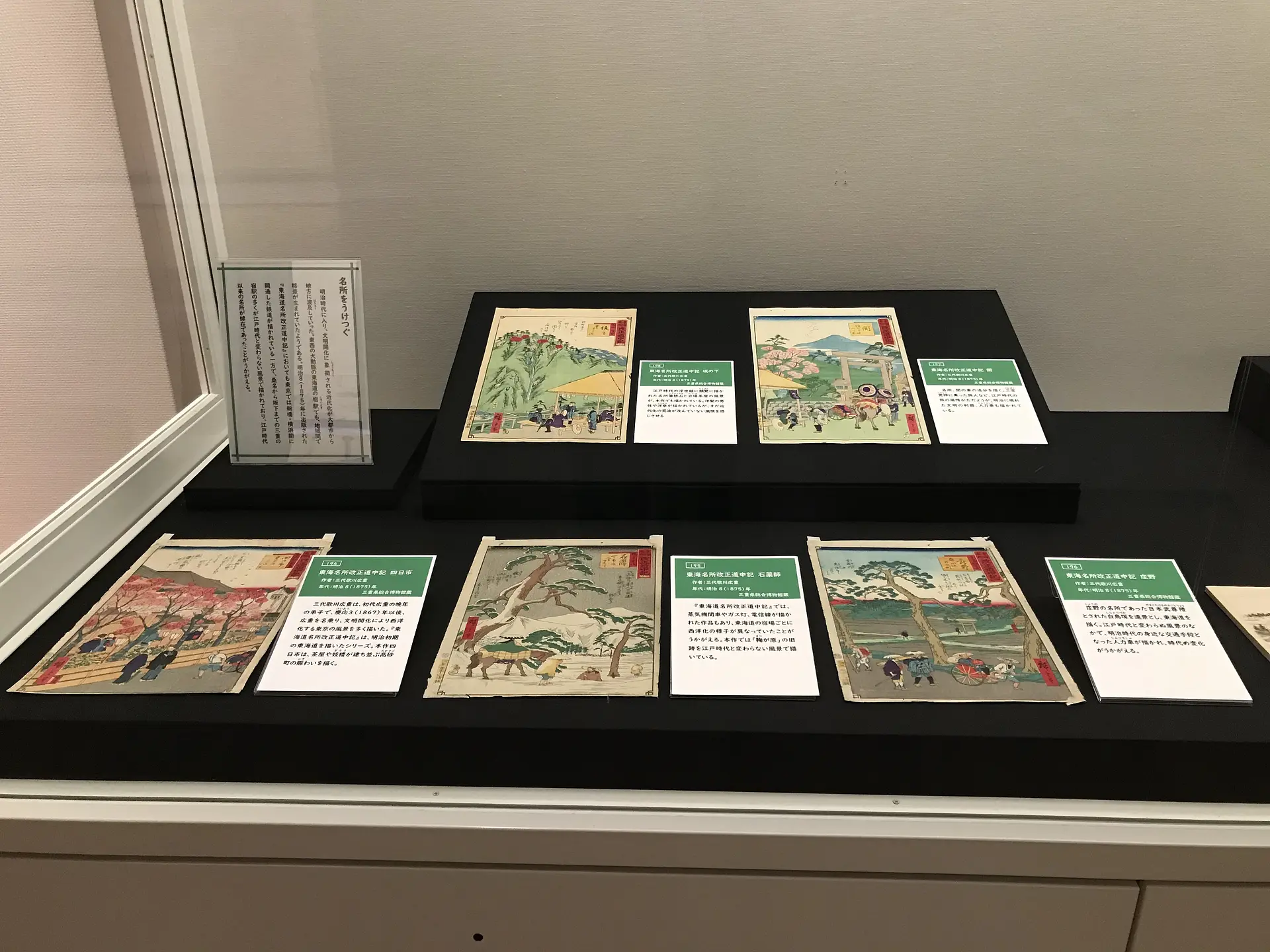 次のコーナーでは挿絵付きの地誌、今でいう旅行ガイドブックのような名所図会が多数展示されています。各地の名所図会や名所浮世絵があって江戸時代の人々の旅行や名所に対する関心の高さがうかがえます。名所図会の挿絵は、俯瞰した構図で詳細な風景画となっているのが特徴です。現代ならばドローンで撮影するような構図ですが、江戸時代は地上の様子を観察し想像で描いたのでしょうか。