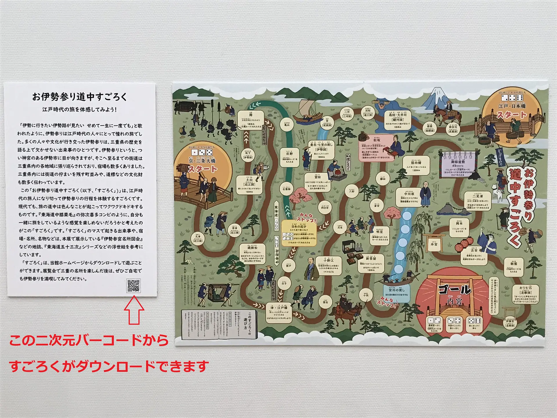 今日見てきたばかりの名所やお伊勢参りの行程がそのまますごろくになっていて、大人も子どもも一緒に楽しめそうな内容になっています。展示を思い出しながらご自宅でも遊んでみてください。展示室のパネルの二次元バーコードからもダウンロードできるMieMuのホームページにアクセスできるそうです。