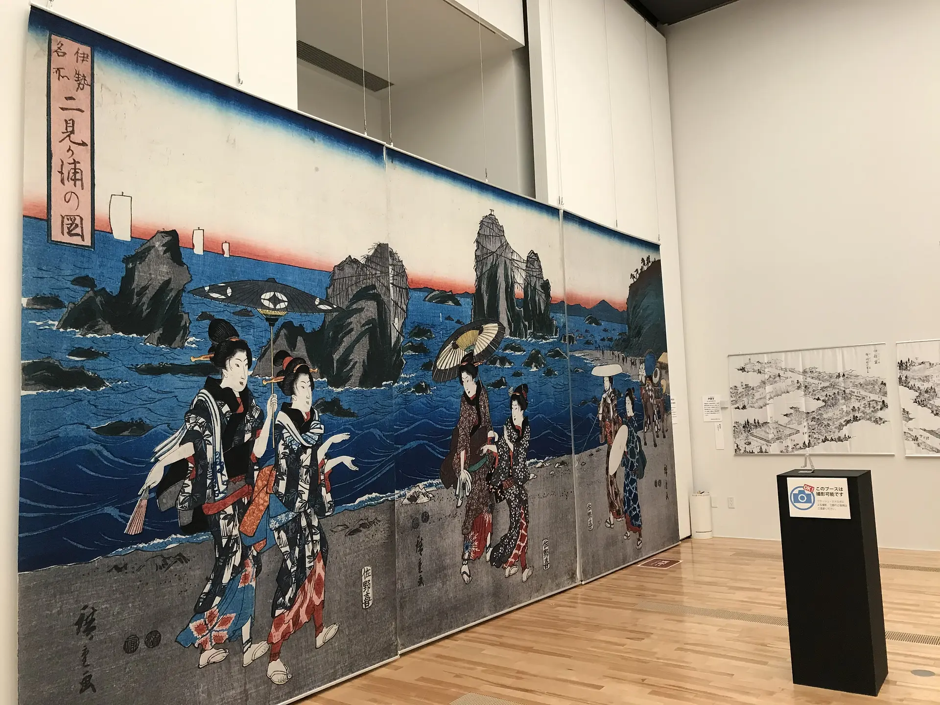 三重県総合博物館(MieMu)では、第30回企画展「名所発見、再発見!~浮世絵でめぐる三重の魅力~」が令和4年4月16日(土)から6月12日(日)まで開催されています。この企画は、令和2年に開催予定であったものがコロナ禍のため中止になったもので、今回満を持しての復活となります。三重県の名所を、浮世絵を中心に屏風絵や絵巻などを通して紹介しています。