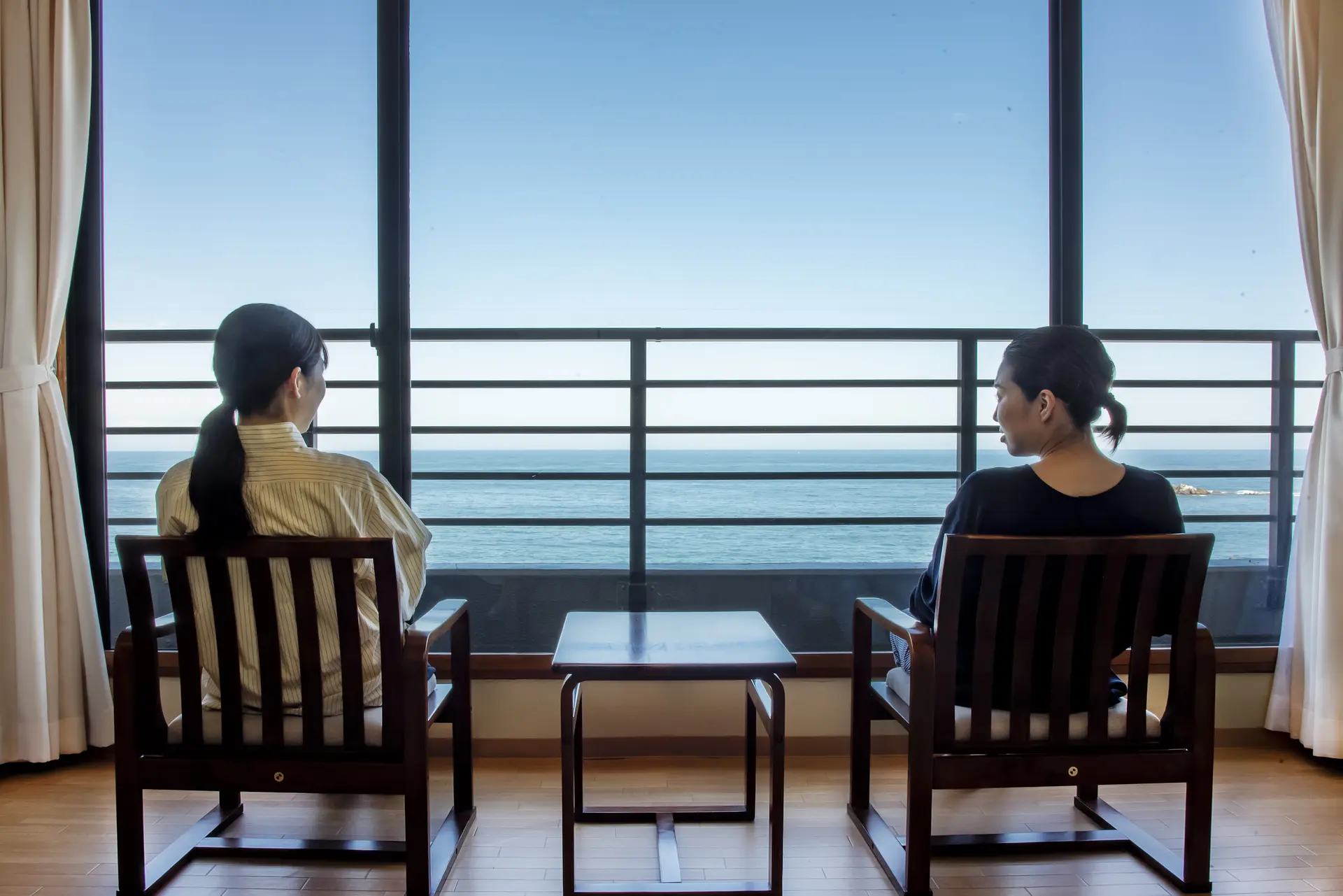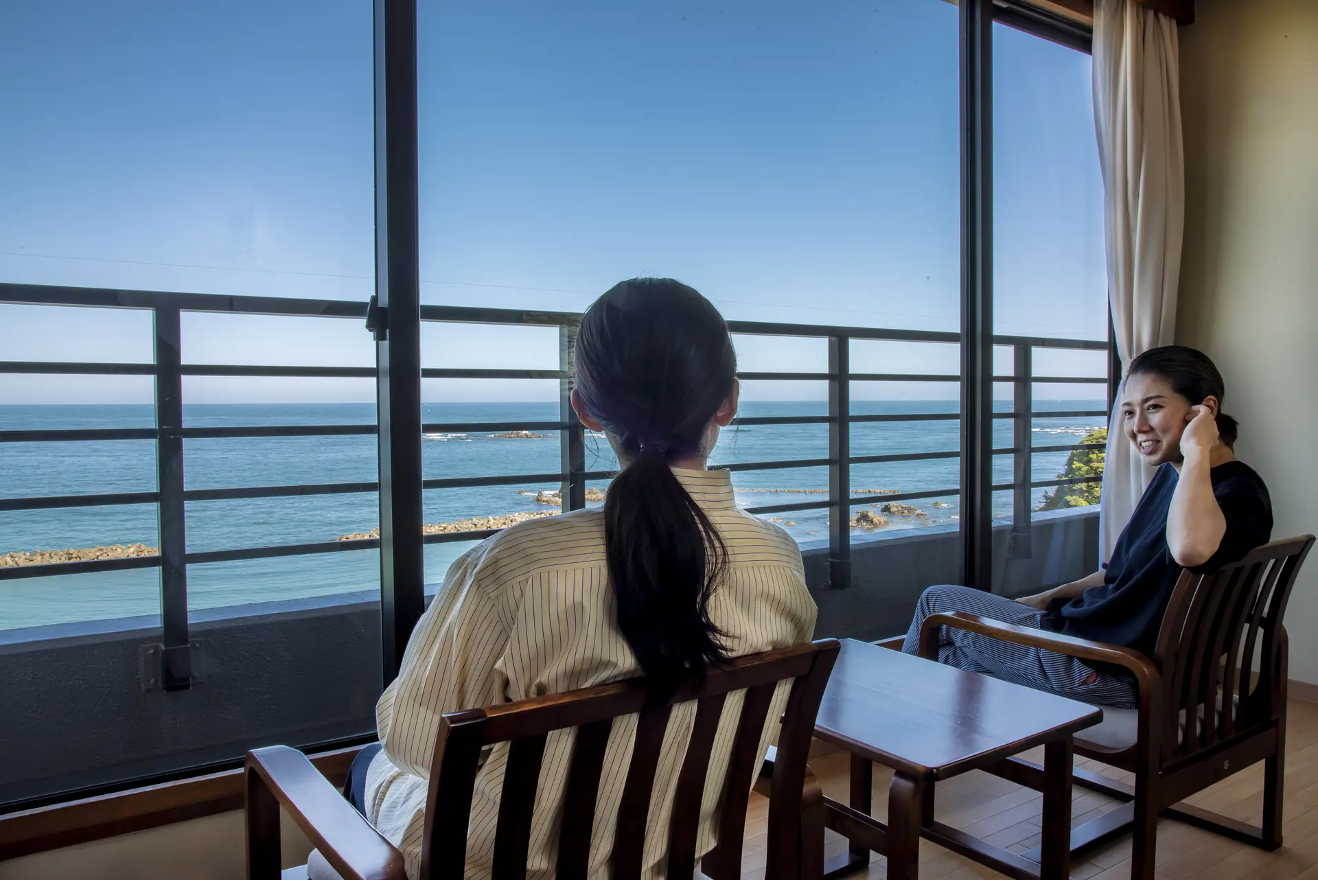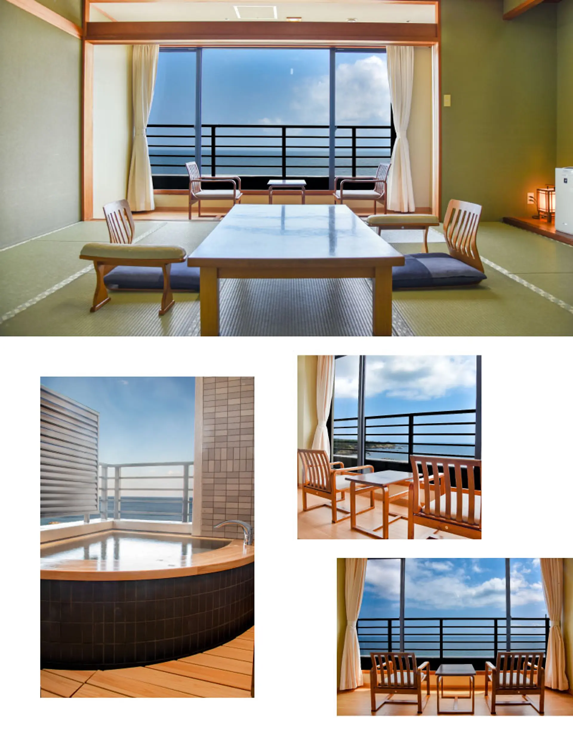 すべての客室が海側にあり、どのお部屋からもオーシャンビューを楽しめます。お部屋タイプはスタンダードの和室「絶景オーシャンフロント」と、海を一望できる露天風呂がついた「露天風呂つき客室」の2タイプがあります。お部屋に入ると、窓一面に広がる海がお出迎え。まるで海の上に立っているかのような感覚を体験できます♪