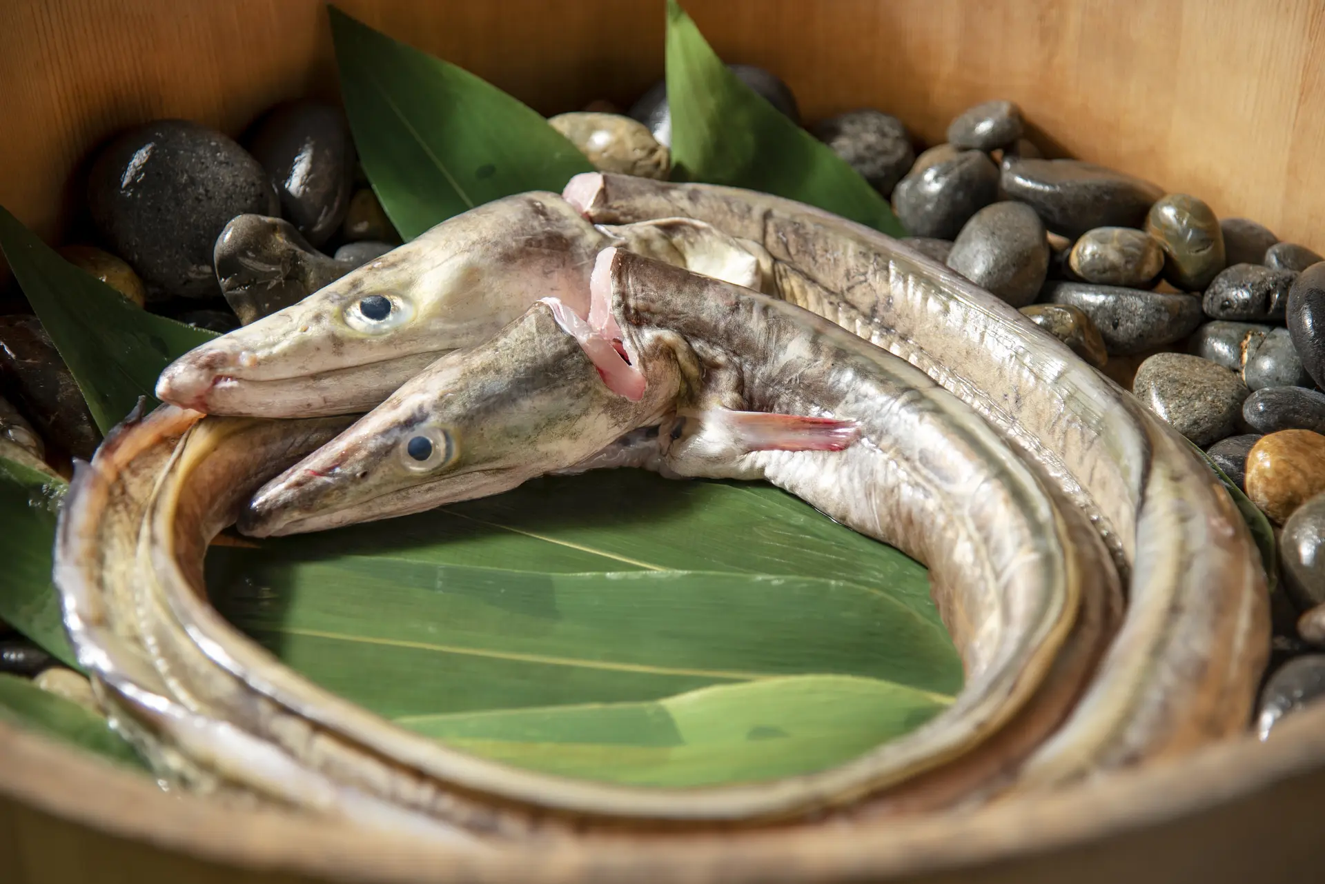三浦料理長:鱧の旬といえば、「真夏」と思われる方が多いのではないでしょうか。祇園祭や天神祭の時期に鱧がメディアによく取り上げられたり、飲食店でも提供されることが多いので真夏といったイメージが強いのだと思います。もちろん真夏の鱧は美味しいのですが、個人的には、梅雨の水を飲んだ6月から7月にかけての鱧が、より美味だと思っています。まだ皮も薄く、鱧しゃぶにするには最高の時期だと思っています。