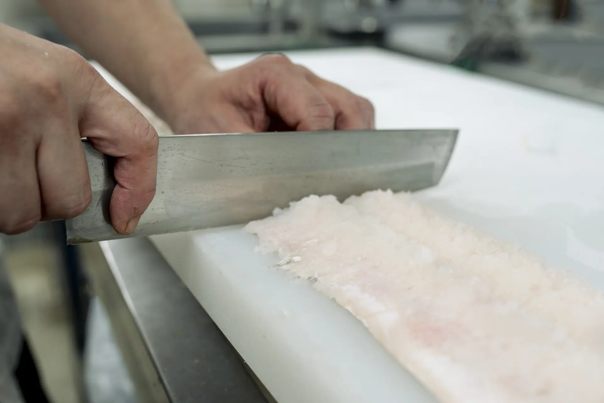 三浦料理長:鱧といえば、骨を細かく断つ「骨切り」のイメージが強い方も多いのではないでしょうか。骨切りは料理人の中でも難しい技術のひとつとされています。骨切りにもいくつかこだわりがあり、その中から1点を紹介します。背ヒレを取った際に皮側の軟骨は取れるのですが、身側の軟骨は残ったままになります。この身側の軟骨を取る際に皮を切ってしまう可能性があるので、熟練の技術が必要とされます。そのままでも食べられるのですが、取った方が口当たりは抜群に良くなります。なのでこの軟骨をしっかり取り除いてお出ししています。