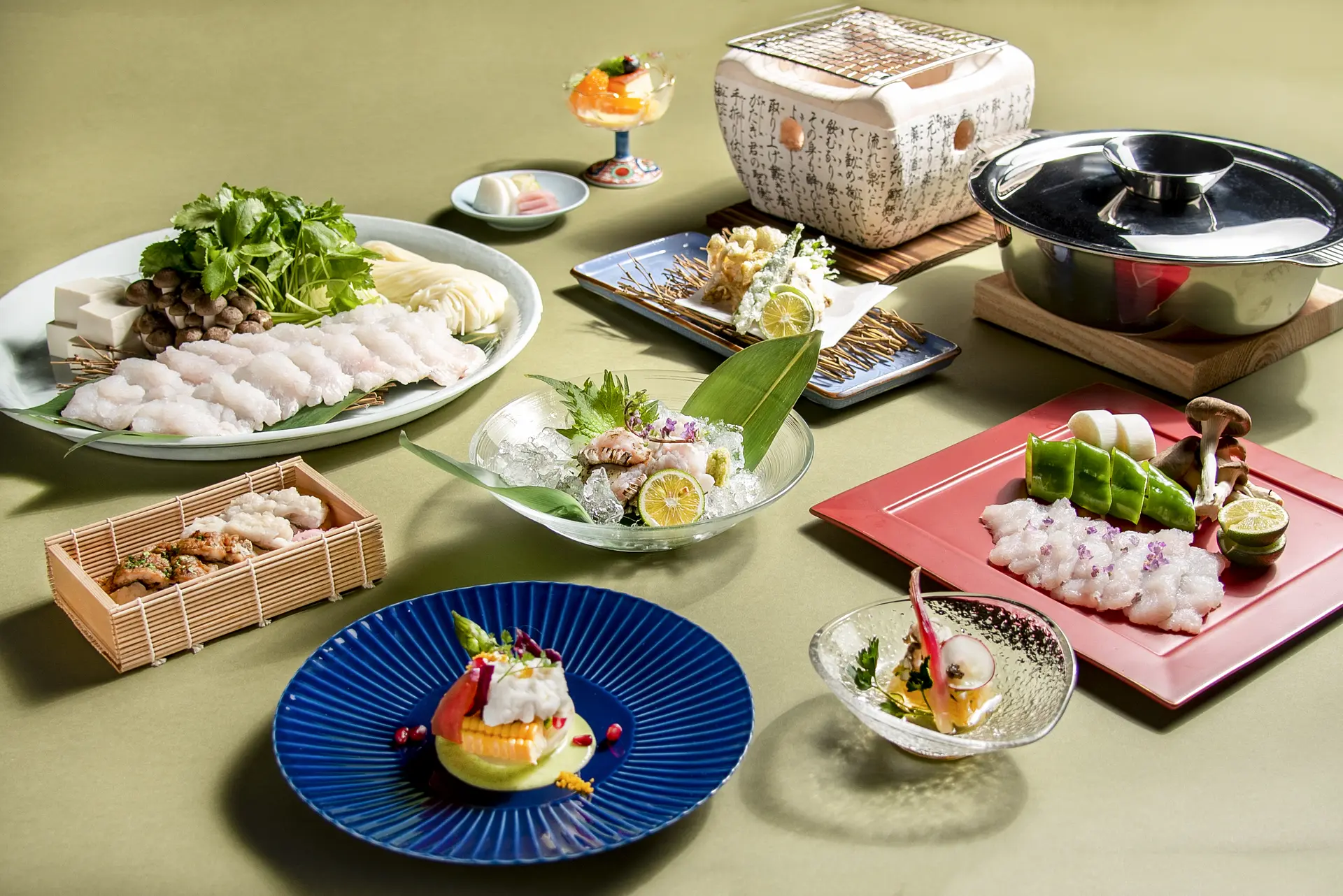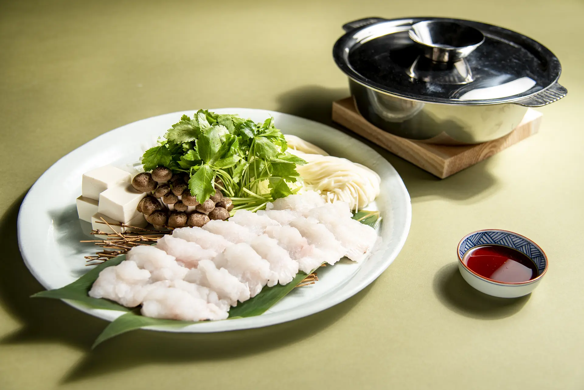 メインの料理となる鱧しゃぶ。旨味がぎゅっと凝縮された、こだわりの鱧のスープの味わいを楽しめます。野菜をいれることで鱧のスープに野菜の出汁が出て、最高の出汁が完成。