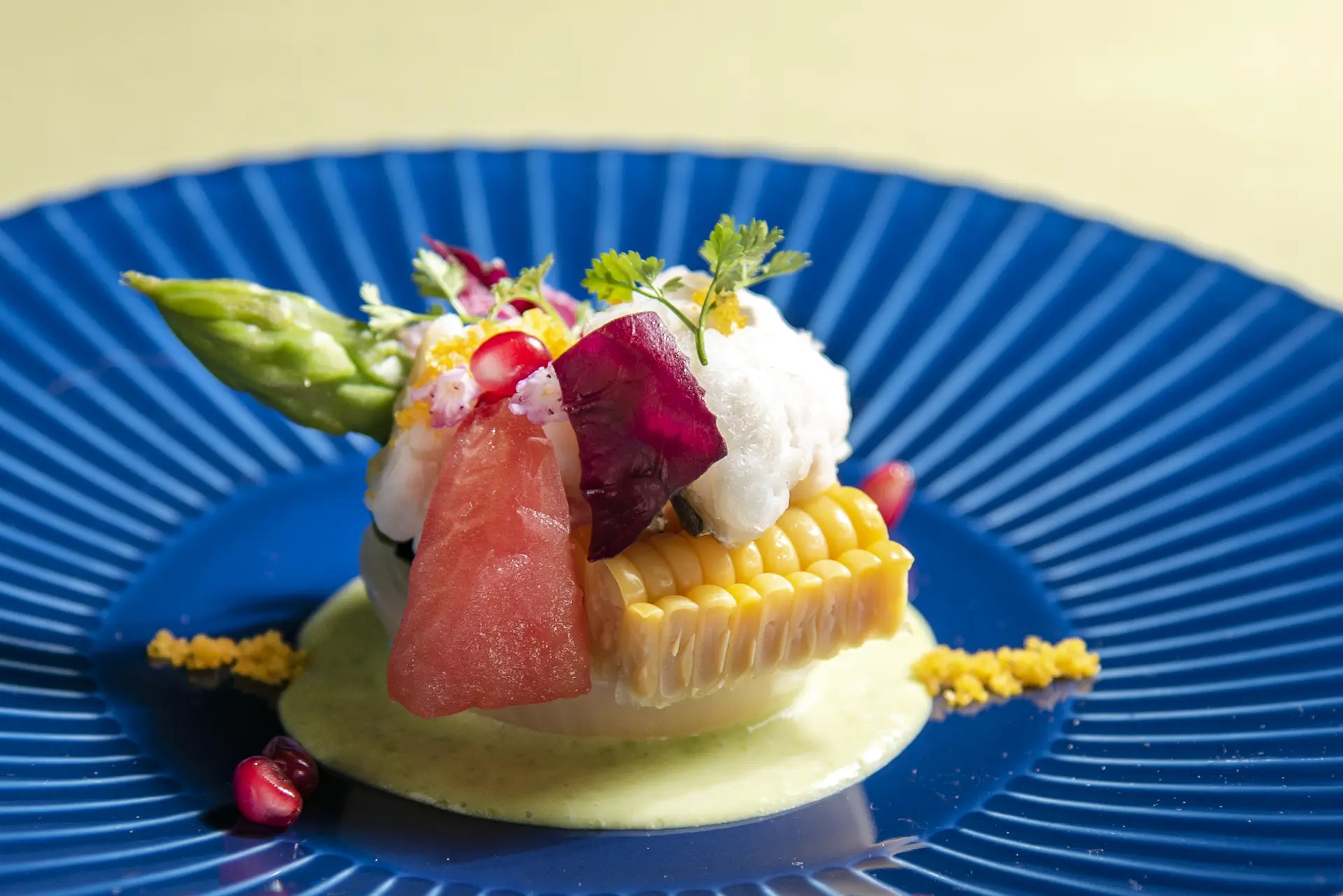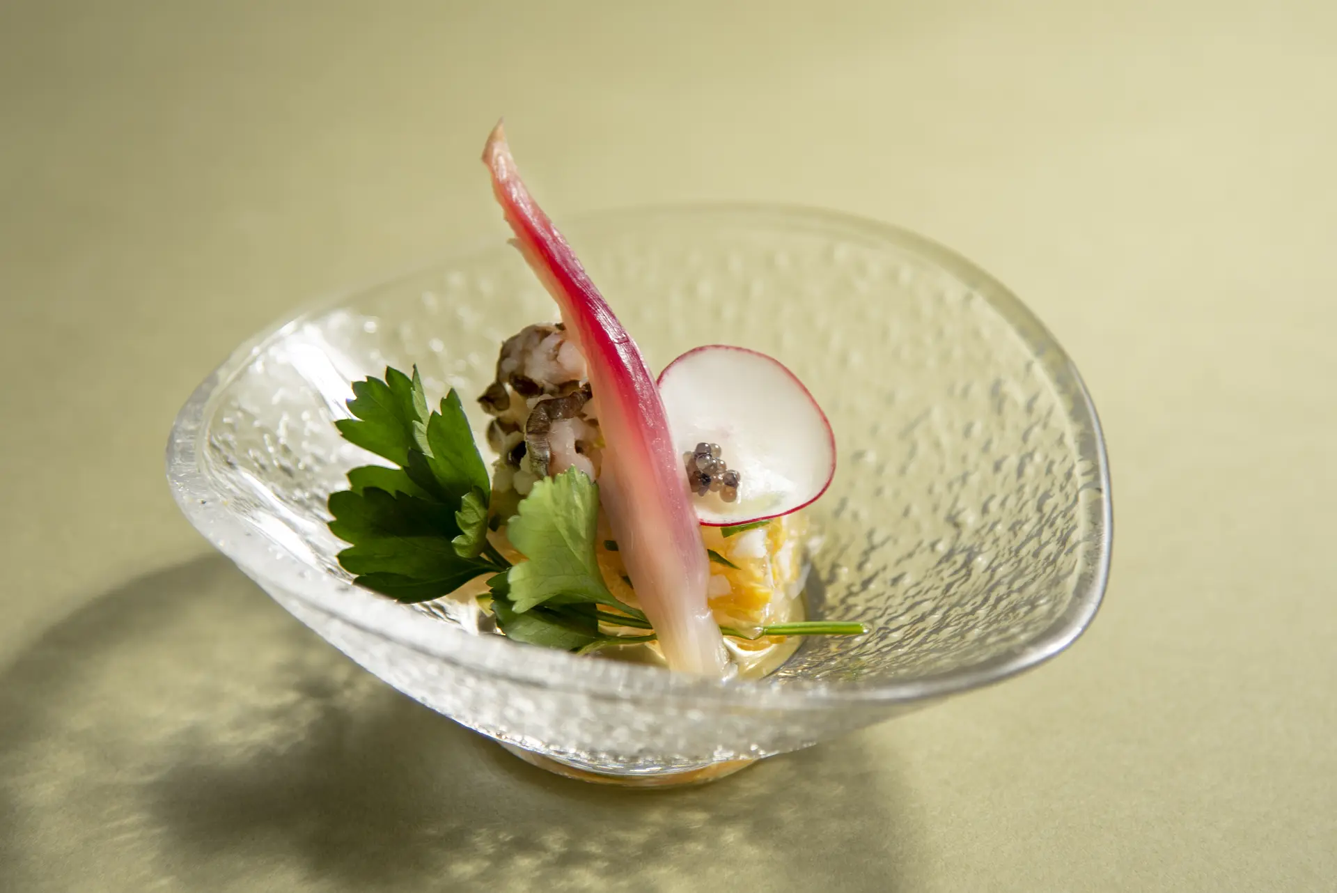 単調になりがちな鱧のフルコースの中で、あえて鱧を脇役に添えた和洋折衷の一品。旬の野菜に酒蒸しにした鱧を合わせました。アボカドソースは鱧のスープをつかってつくっています。ソースと絡めて野菜の甘みや鱧の旨味を感じてください。