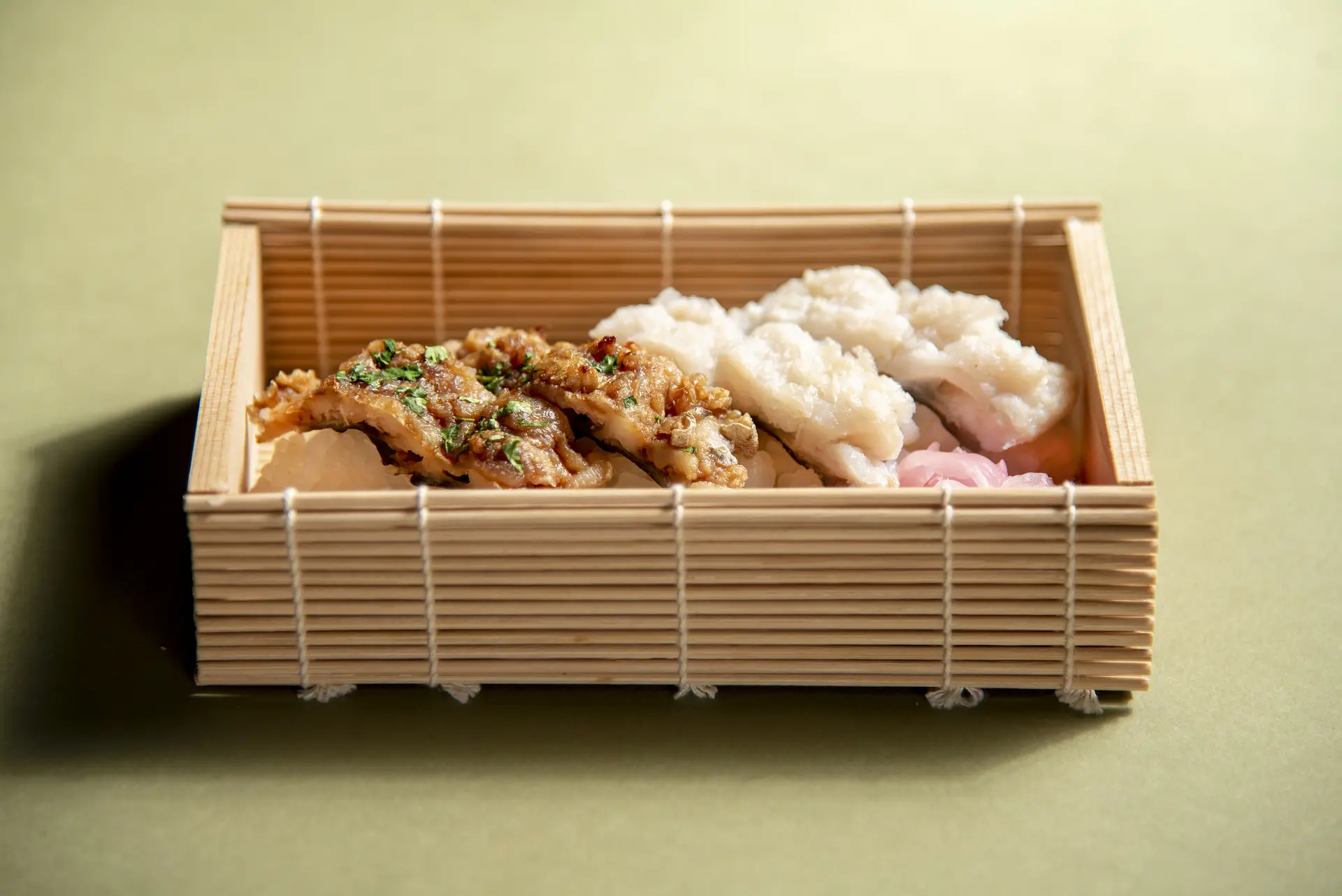 鱧の照り焼きと塩焼きの二色で源平合戦の紅白を表現したお寿司。一般的に照り焼きのタレは「鯛」の骨を焼いてつくりますが、一井では魚ごとにタレの作り方を変えています。鱧の場合は、「鱧」の骨を焼いてタレをつくっています。照り焼きのしゃりにはどんこ椎茸を混ぜ込み、叩き木の芽を散らしています。塩焼きはしゃりの上に大葉、梅肉、鱧の順でのせることで梅肉がしゃりににじまないようにしています。