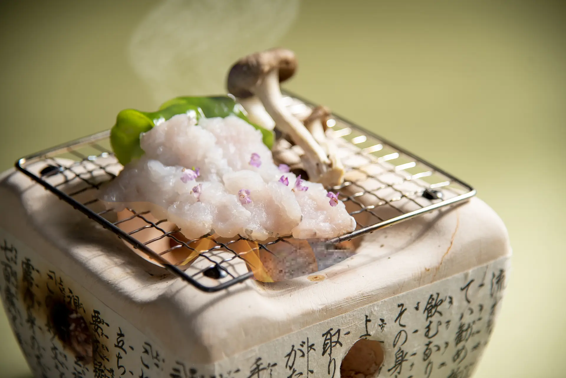 鱧を炭火で香ばしく焼き上げます。皮目をしっかり焼いてから身をさっと焼くことで、皮は香ばしく、身はふっくらやわらかになります。梅肉、ポン酢、酢橘からお好みの味付けでお楽しみください。