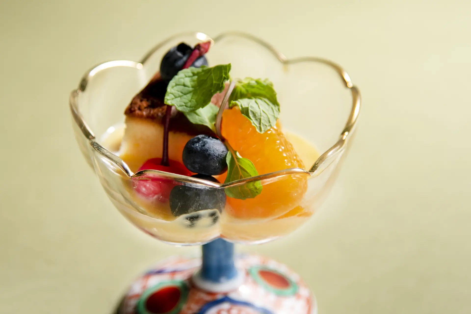 最後はさっぱりとした季節の果物に、ほのかな甘みを感じるアングレーズソースを絡めてお召し上がりください。