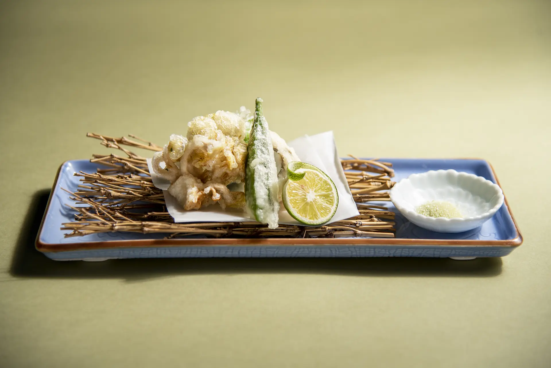 新牛蒡を鱧で巻いた八幡巻きと、鱧に梅肉をつけて大葉で巻いた二種を天ぷらにしました。鱧だけの天ぷらにするのではなく、季節の野菜と合わせる出会いの料理になっている点も料理長のこだわりです。