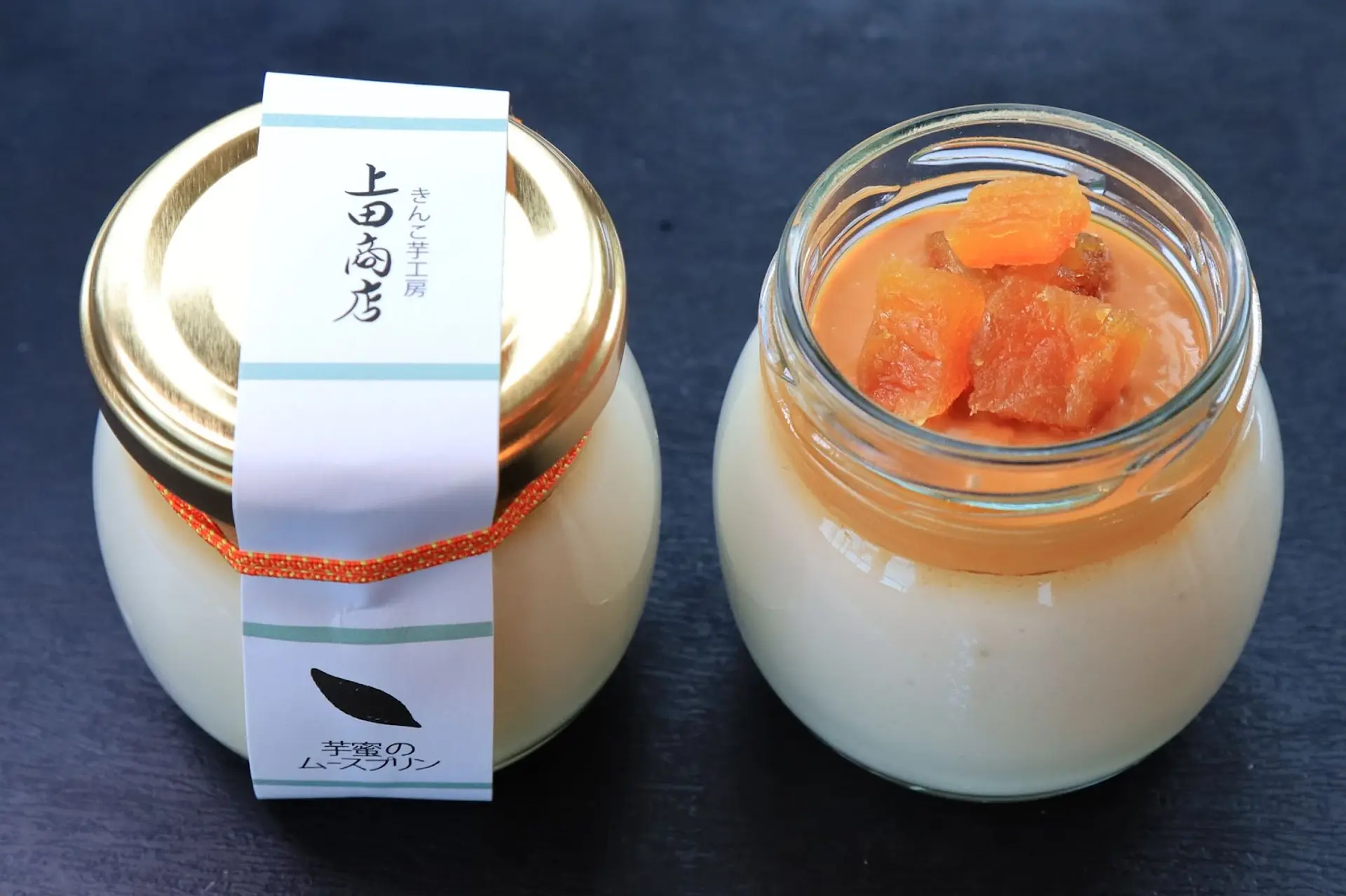 上記写真は芋蜜のムースプリン(プレーン)で、希少な芋蜜と干し芋がたっぷり入った贅沢スイーツ!