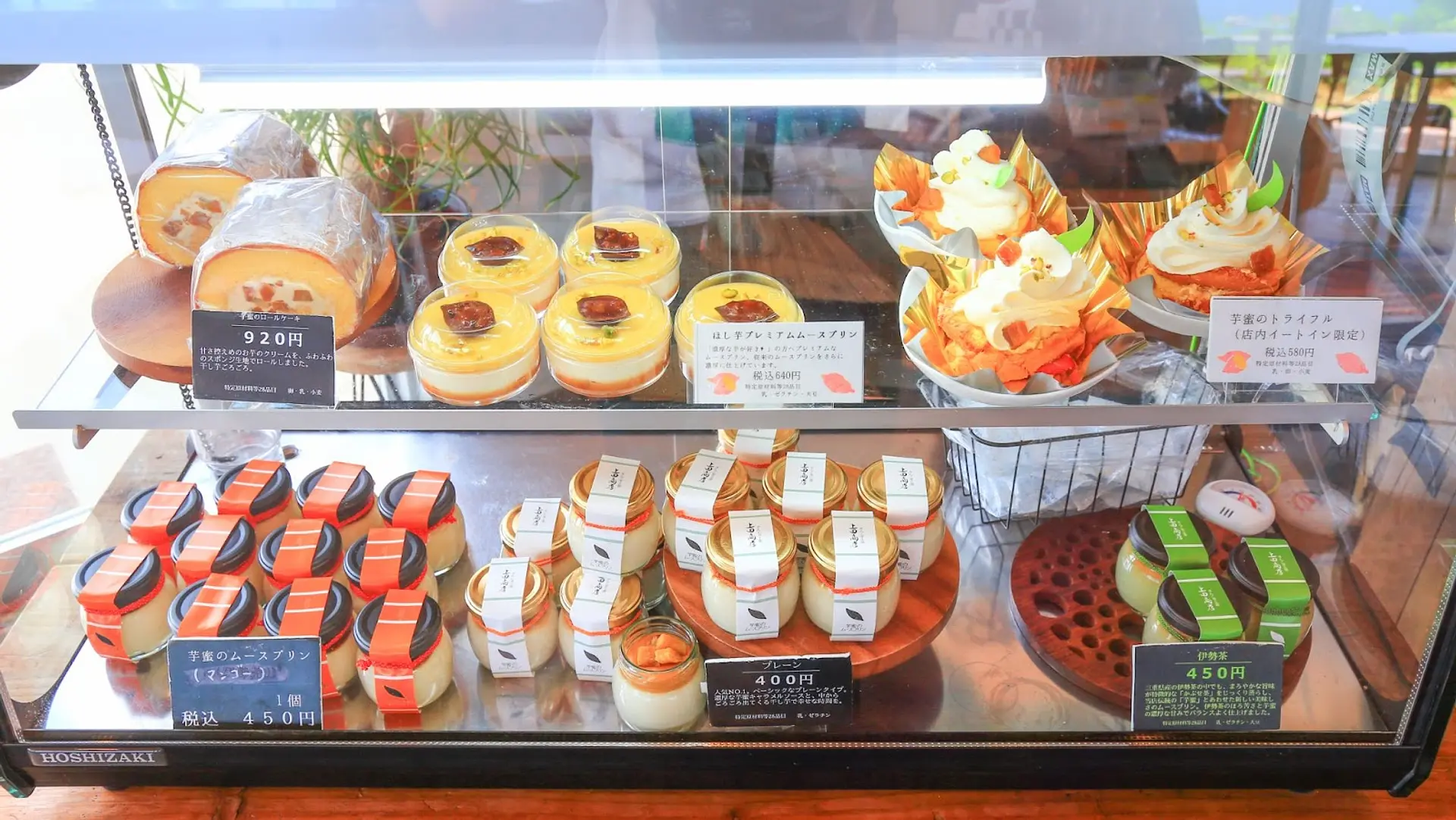 店内のショーケースには干し芋を使ったスイーツがズラリと並んでおり、テイクアウトで購入することもできます。