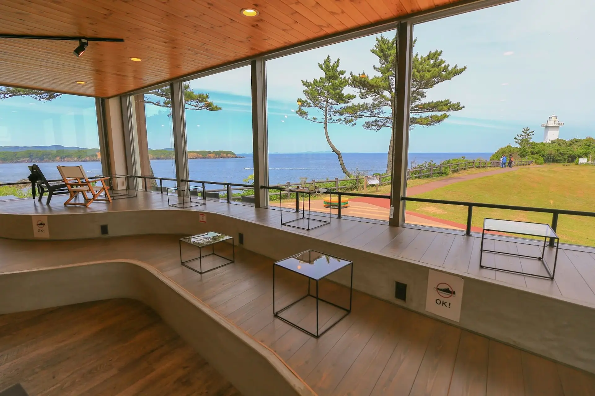 窓際は海と灯台を一望でき、小型のテーブルを自由に移動させて寛ぐことができます。