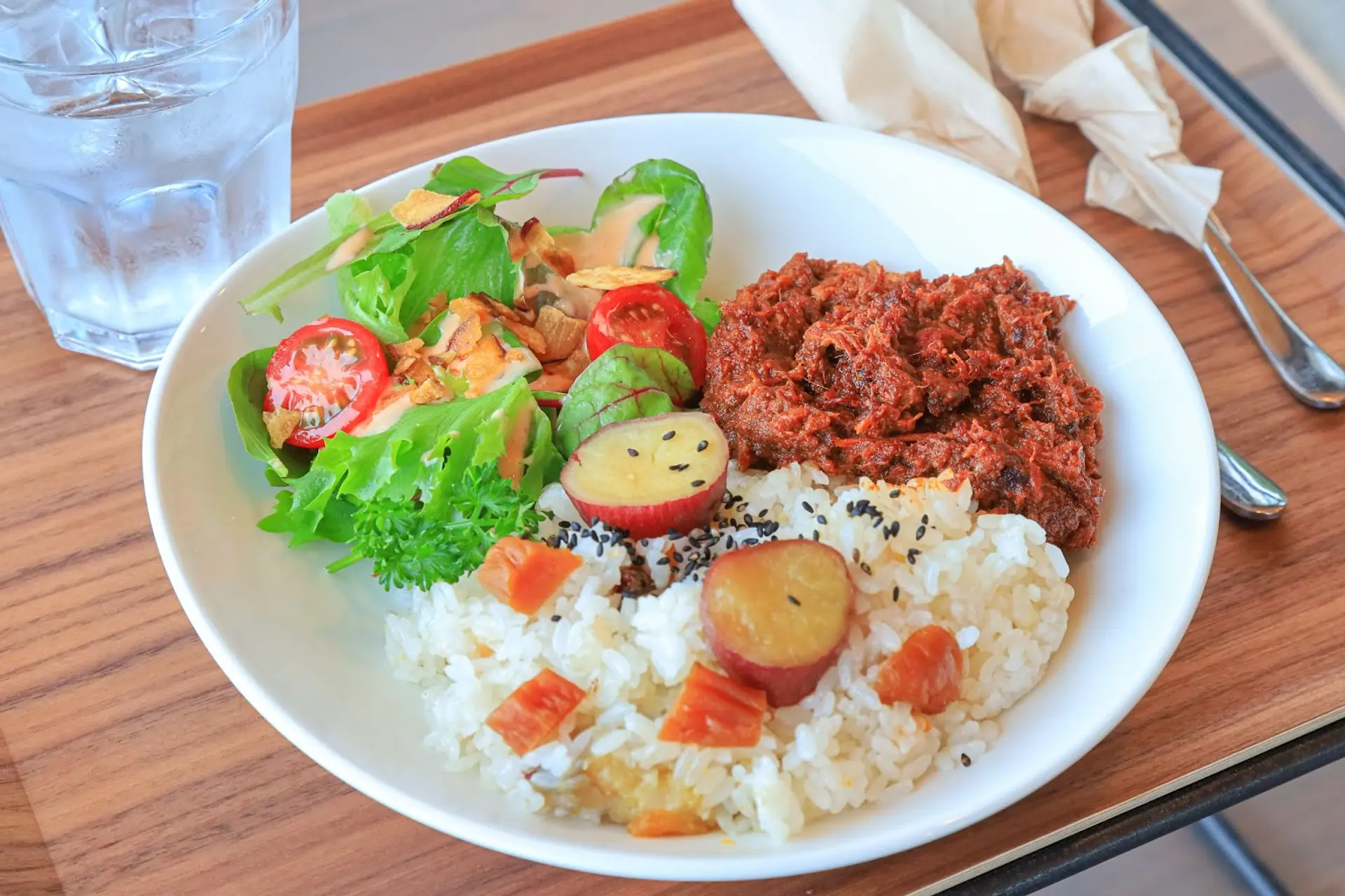 このプレートメニューは、さつまいもや干し芋が入ったお芋ご飯に、自家製スパイスカレーとサラダを添えた内容です。