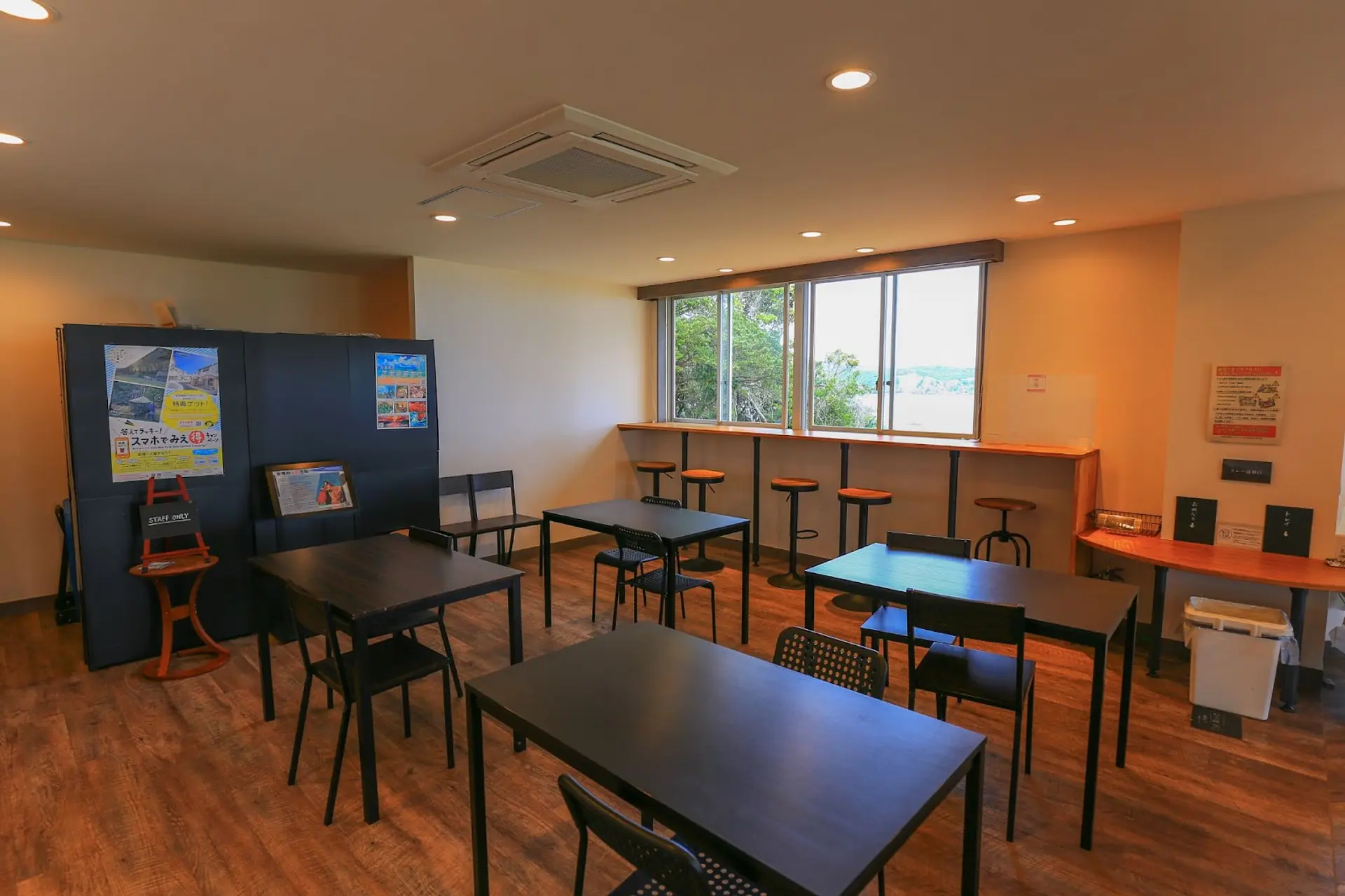 テーブル席も多数あり、広々とした間隔で配置されています。窓際の席からは的矢湾が見え、天候が良ければ富士山が見えることも!