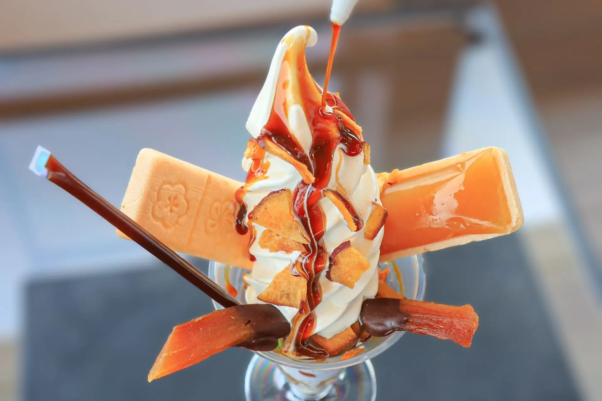 ソフトクリームには「芋ちっぷす」「きんこ芋チョコ」「きんこ芋の最中」などがトッピングされており、希少な芋蜜がたっぷりとかかっています♫