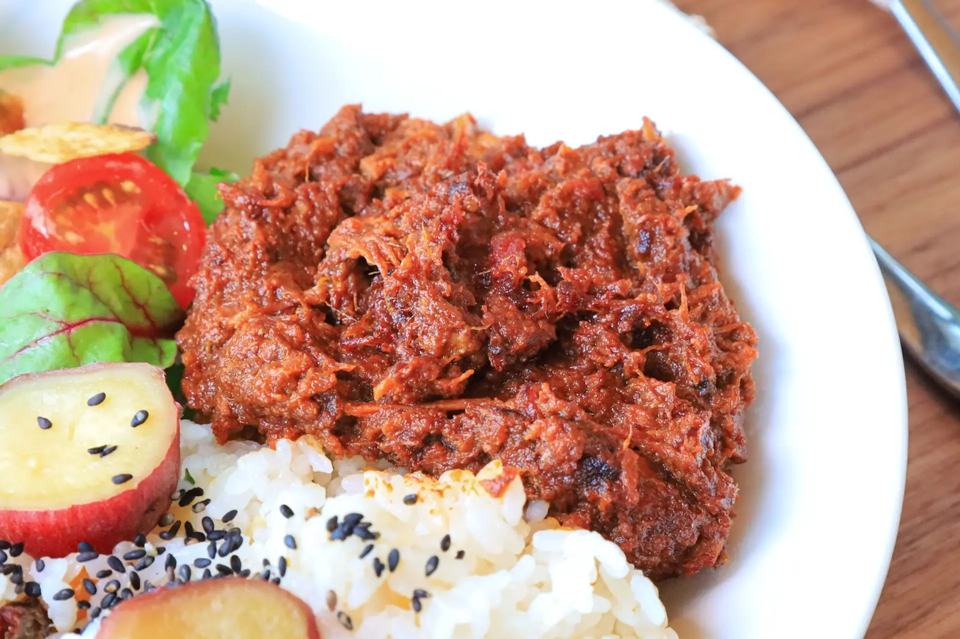 自家製スパイスカレーには体に優しいスパイスがブレンドされ、こだわりの製法で炒めた豚肉と玉ねぎもたっぷり入っています♫