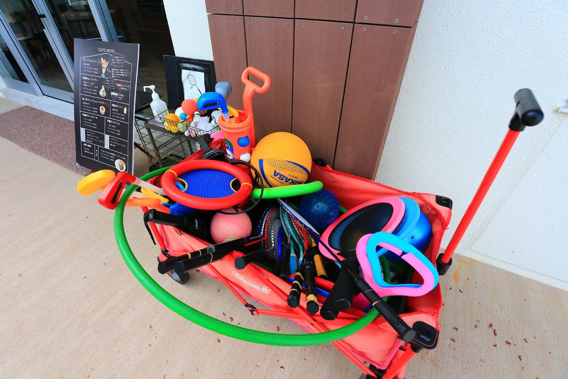 お店の入口では遊具の貸し出しを無料で行っており、バレーボールやフラフープ、バドミントンや子供用のゴルフセットなど盛りだくさん♫