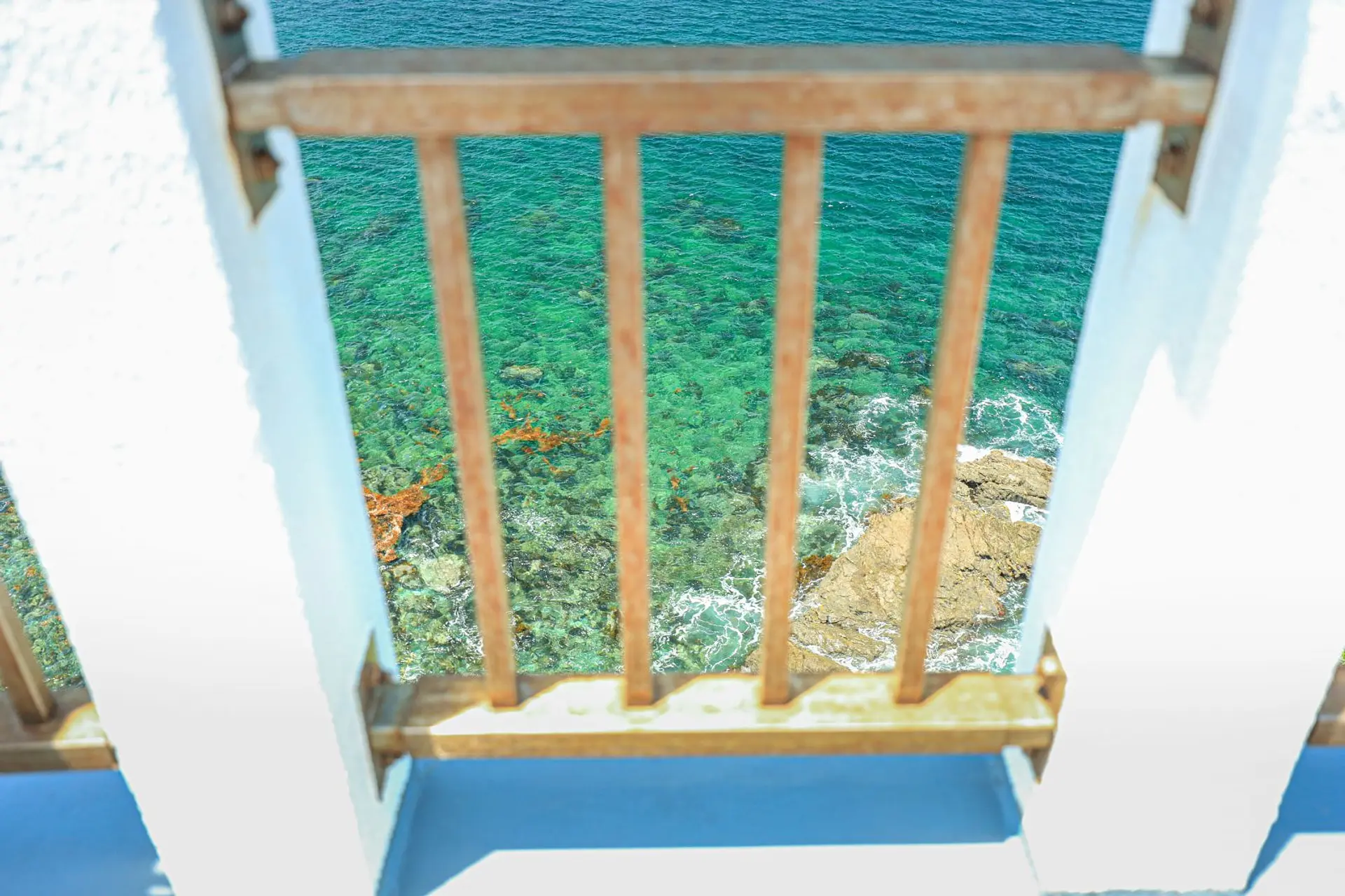 少しかがんで手すり越しに海を眺めると....まるで沖縄の海を想像させる透明度!