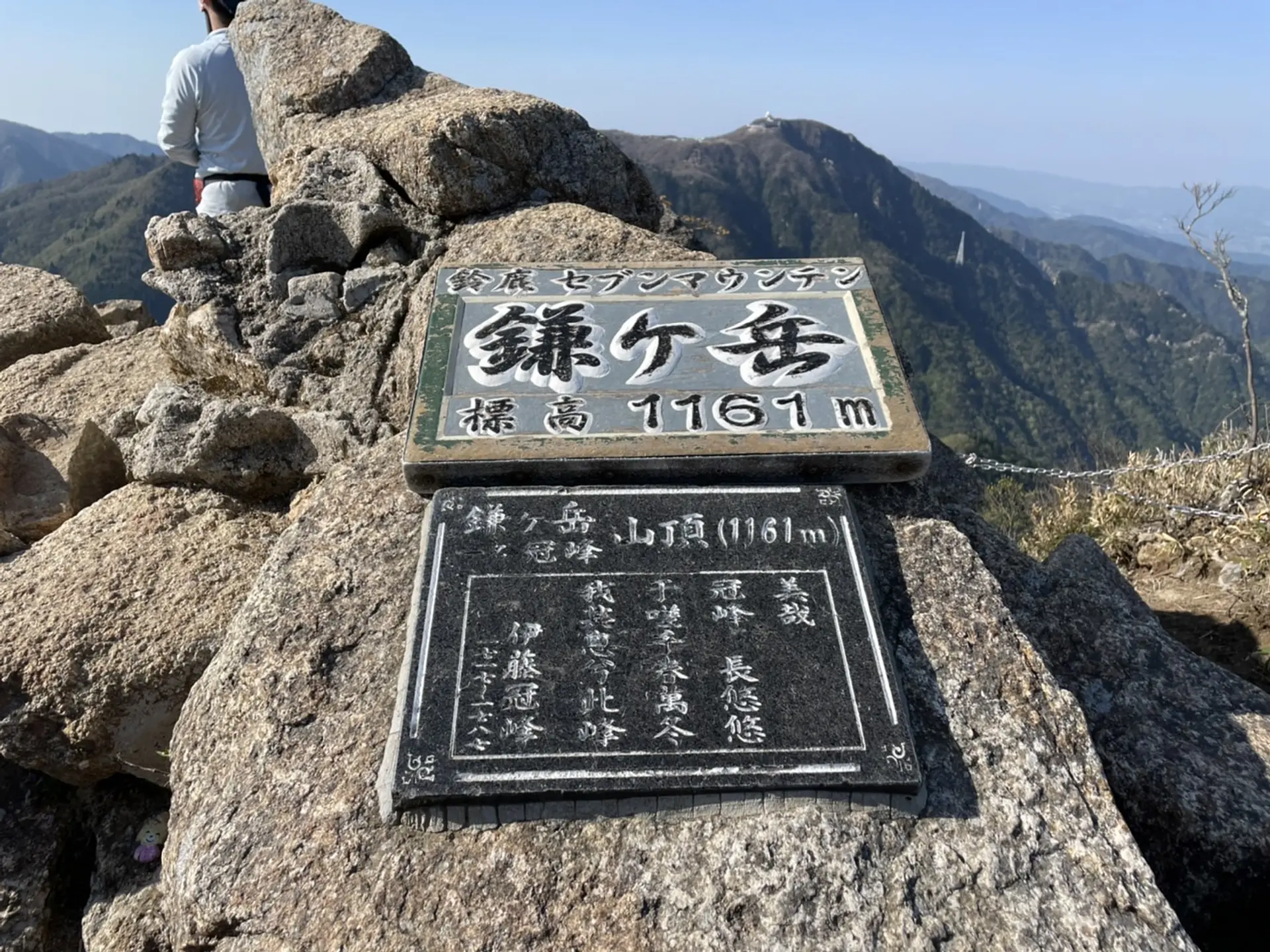 山頂のボードの裏側からお隣の「御在所岳」を一望出来ます。