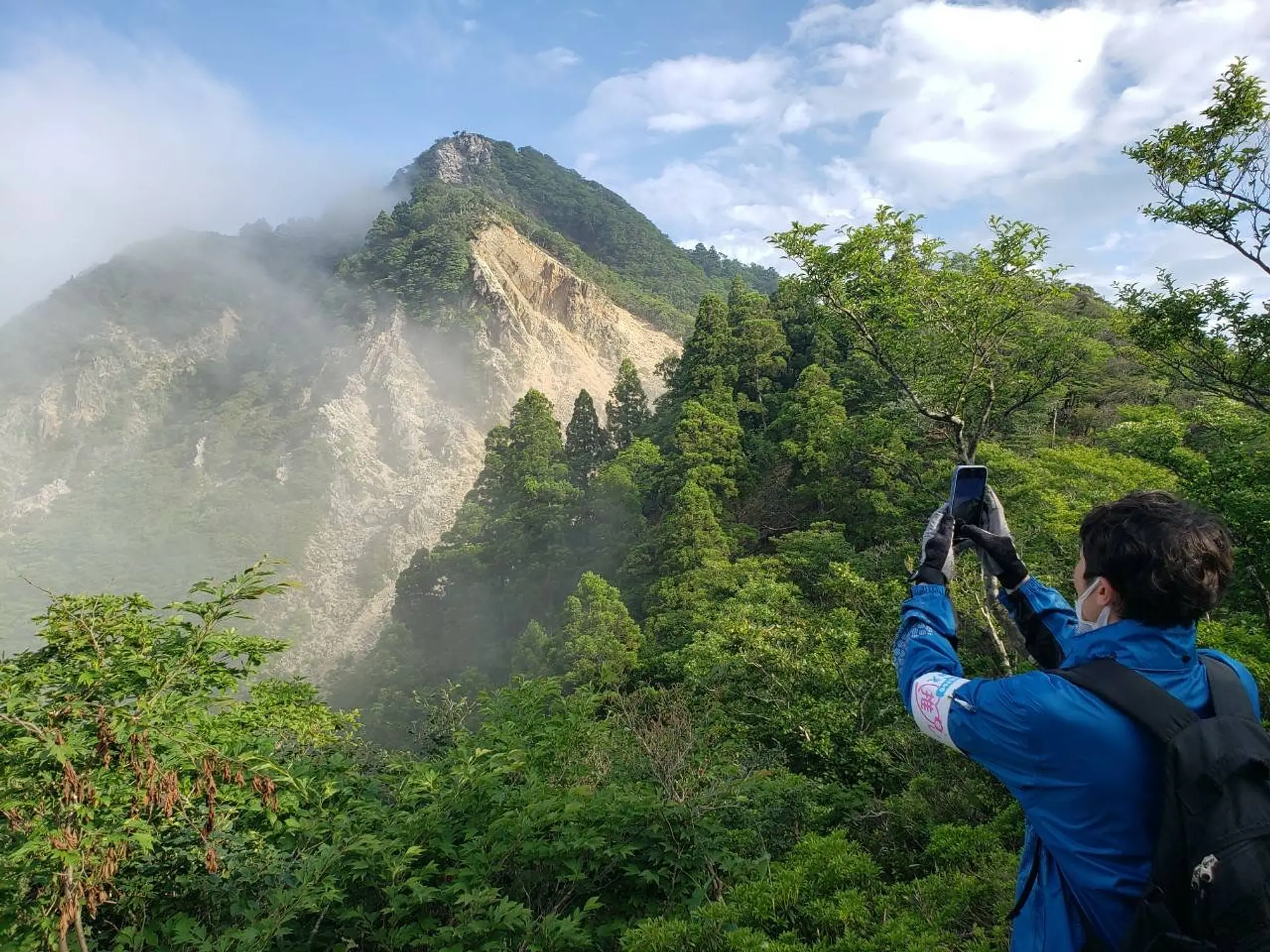 深い霧の中、時折見せる青空とともに姿を現す鎌ヶ岳は過去に無いほど迫力があり、魅力的でした!よしお兄さんも思わずパシャリ。同じ景色は二度とない、登山の醍醐味のひとつですね!