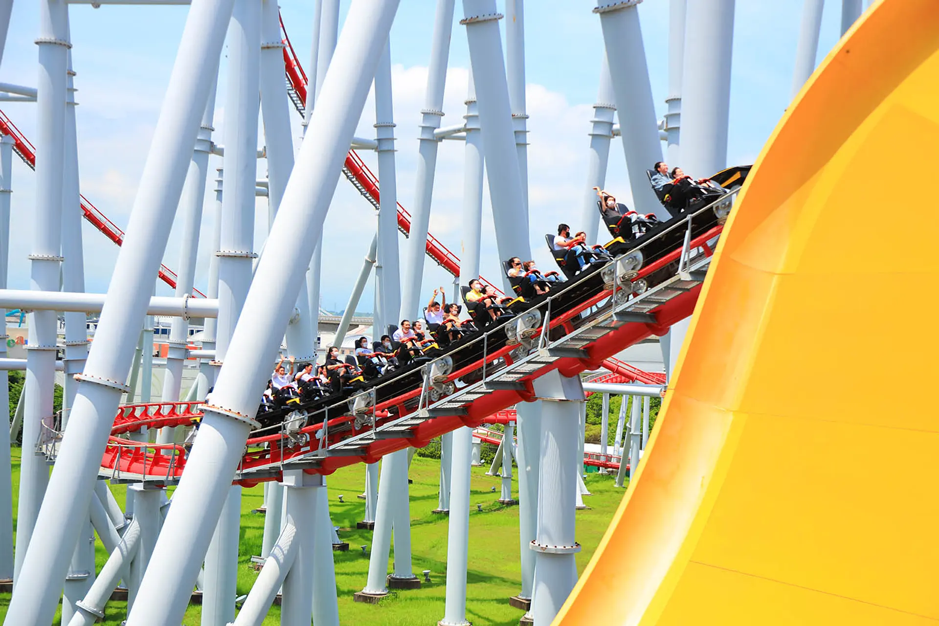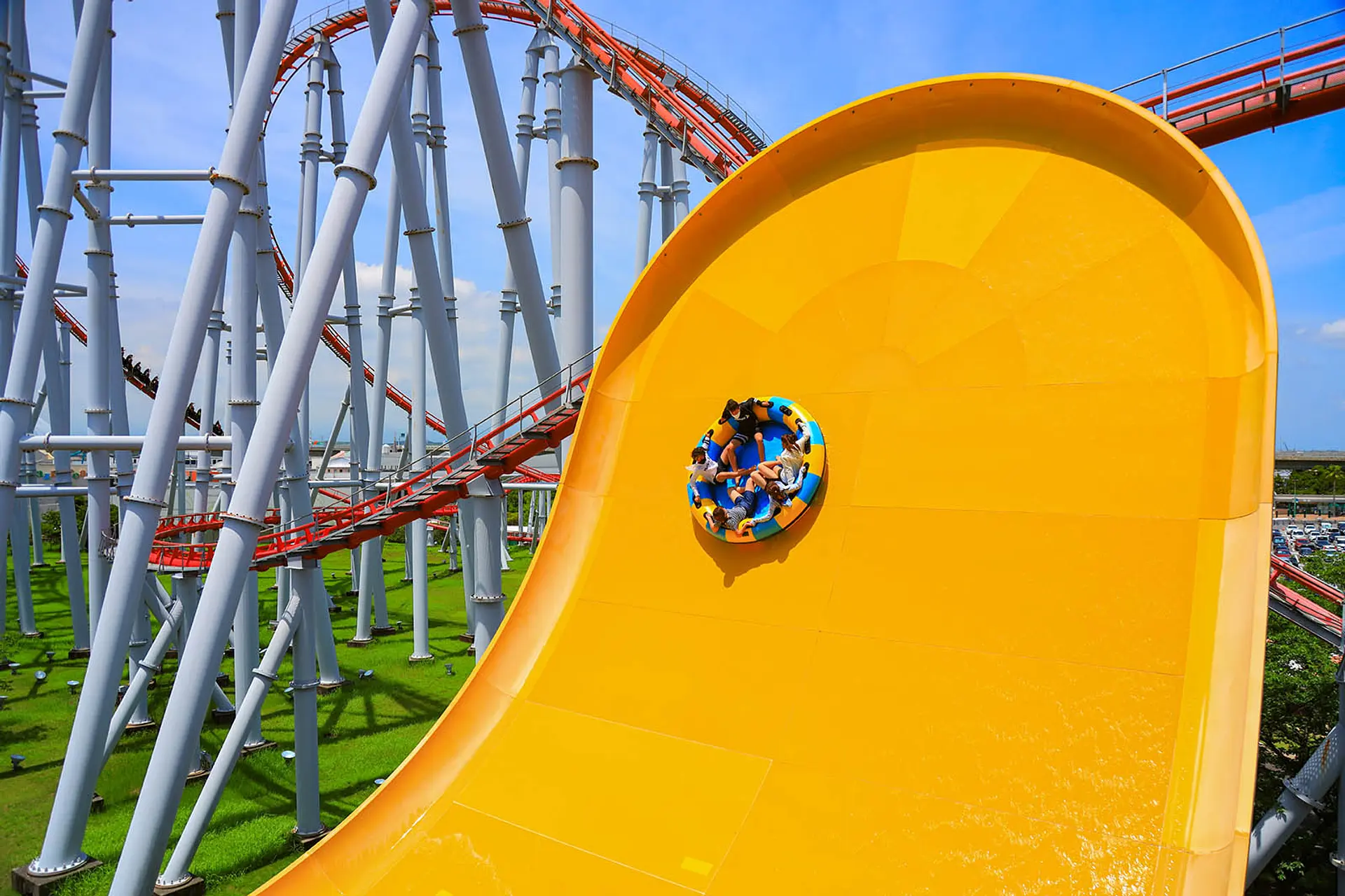 遊園地のジェットコースター「スチールドラゴン2000」がスライダーのすぐ近くを通るので、タイミングが合えばジェットコースターに近づけることも♫