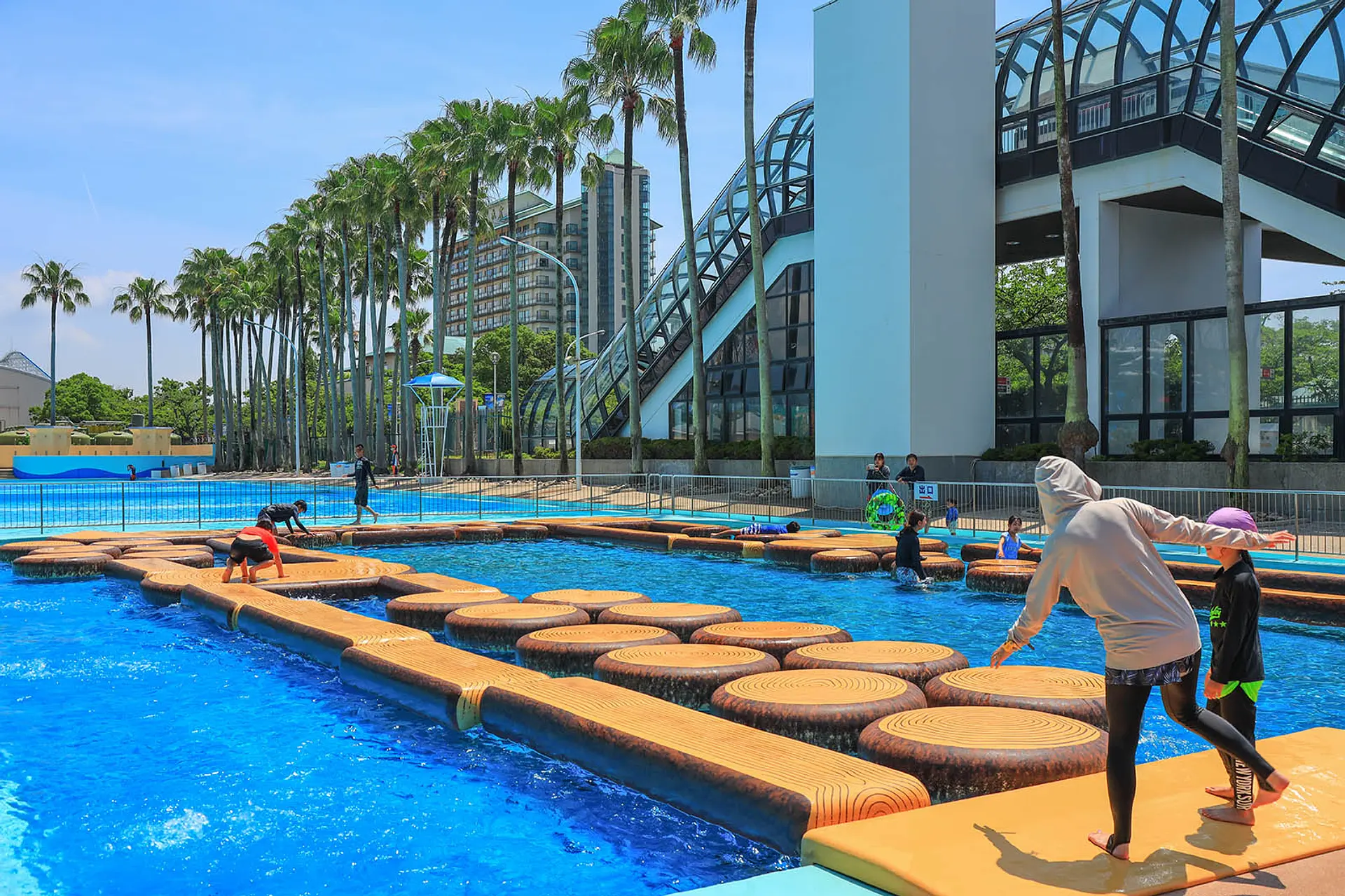 ジャンボ海水プールでハラハラ・ドキドキする水上アスレチックといえば「ぴょん・ぴょん・ドボン!」