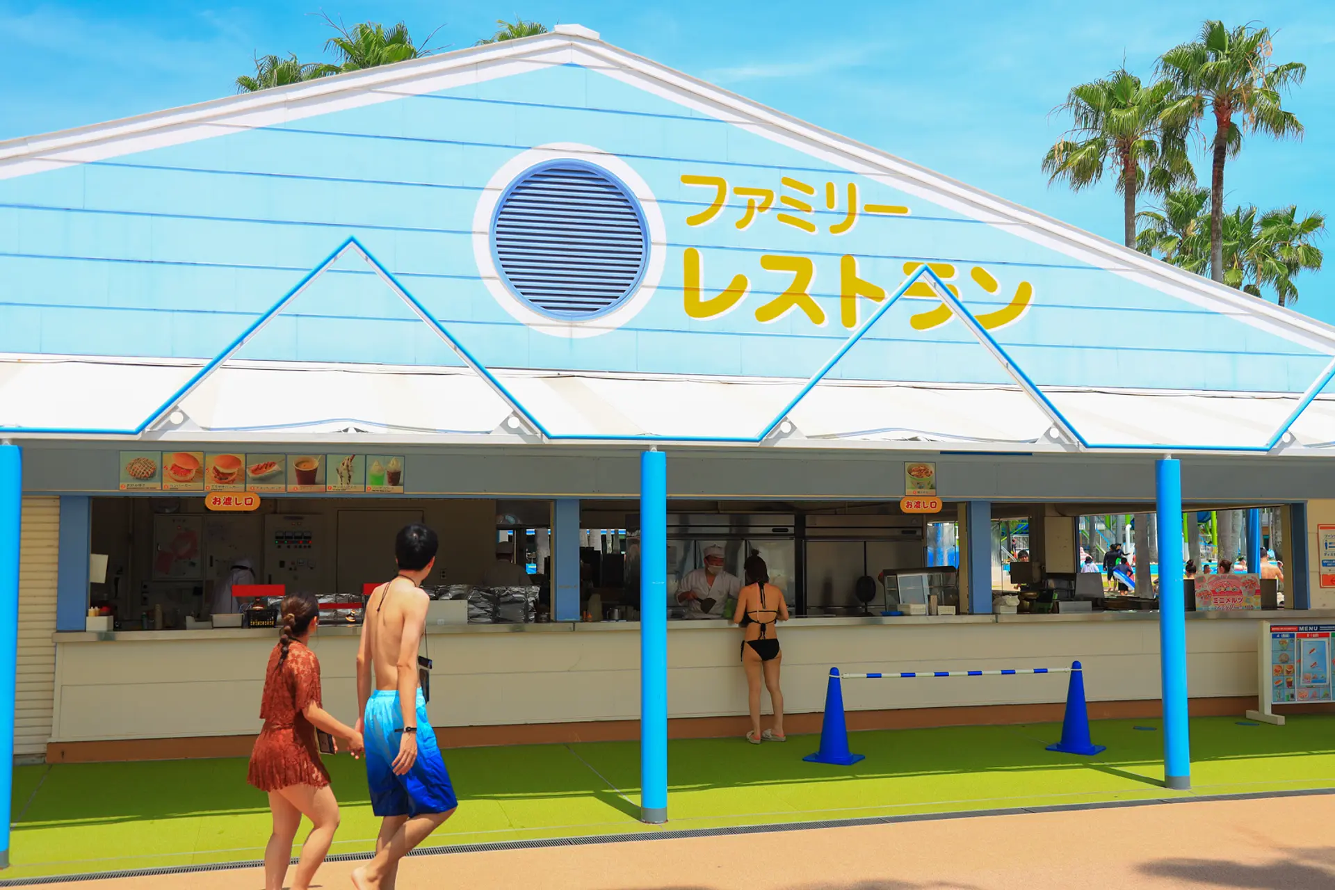 ジャンボ海水プールには軽食やドリンクを注文できるフードコートやレストランがあるので、水着を着たままお食事を楽しむことができます。