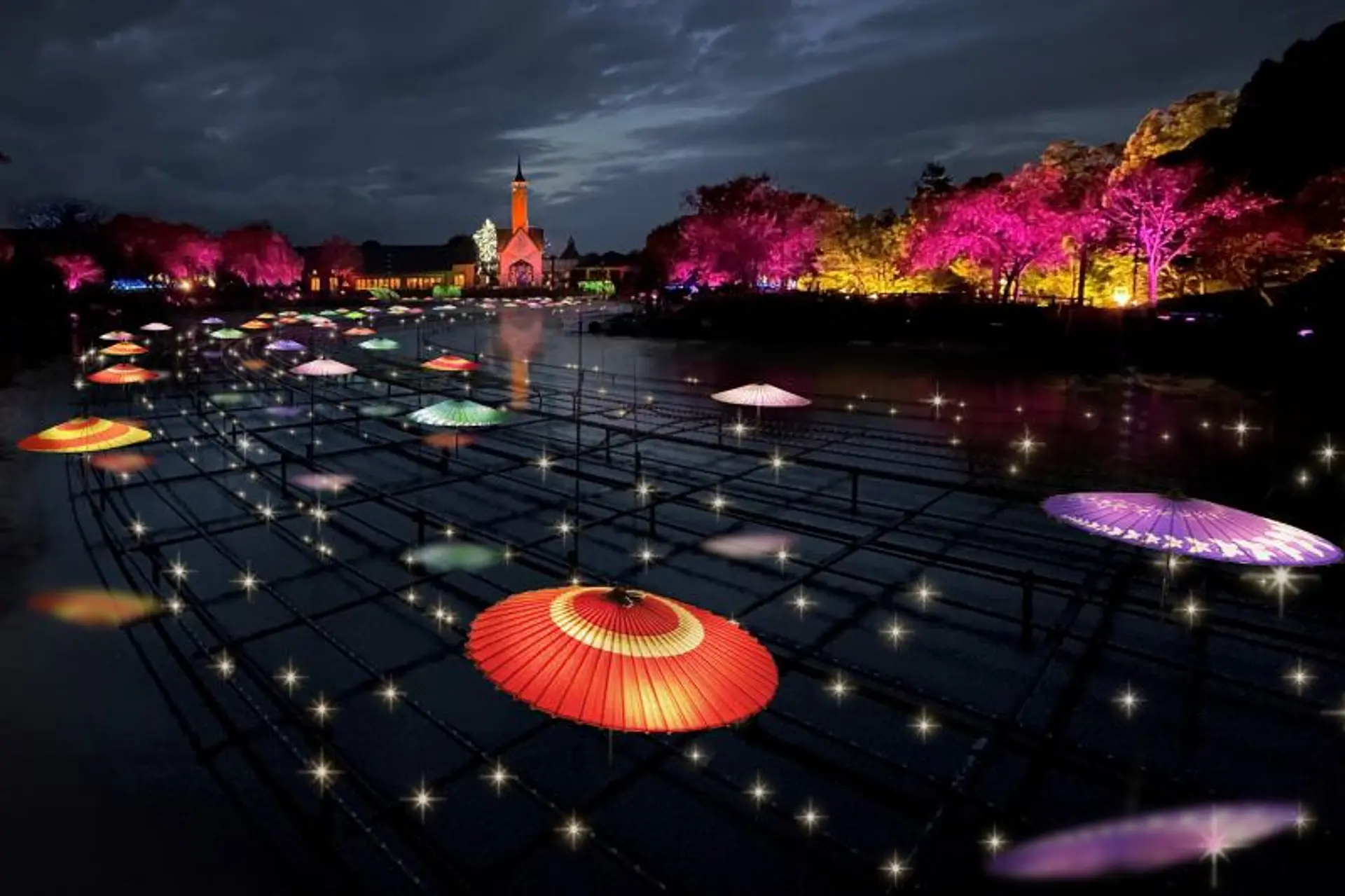 色とりどりの和傘がライトアップにより水辺にぼんやりと浮かび上がります。