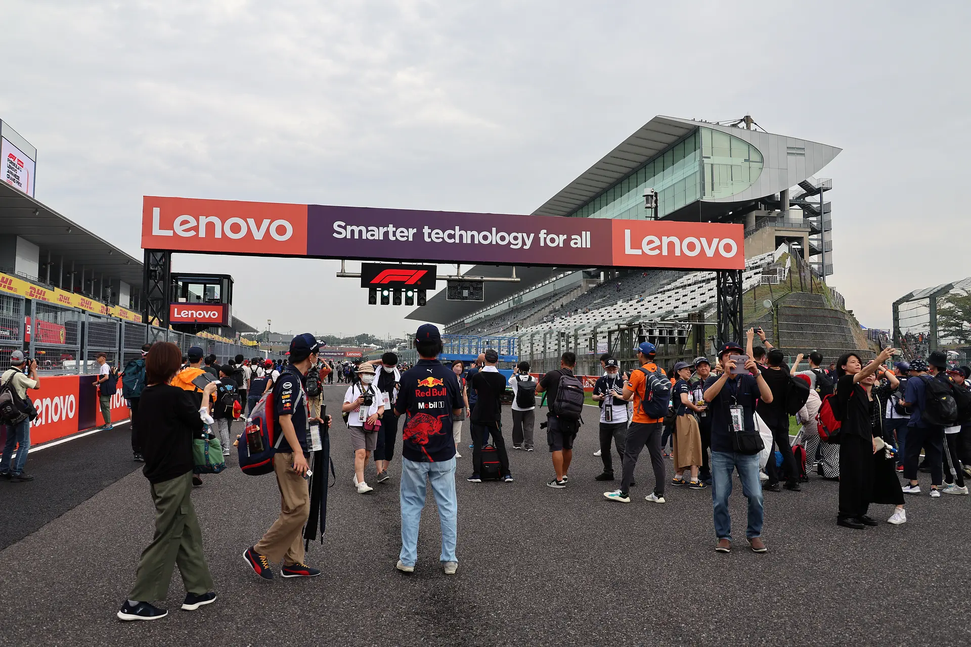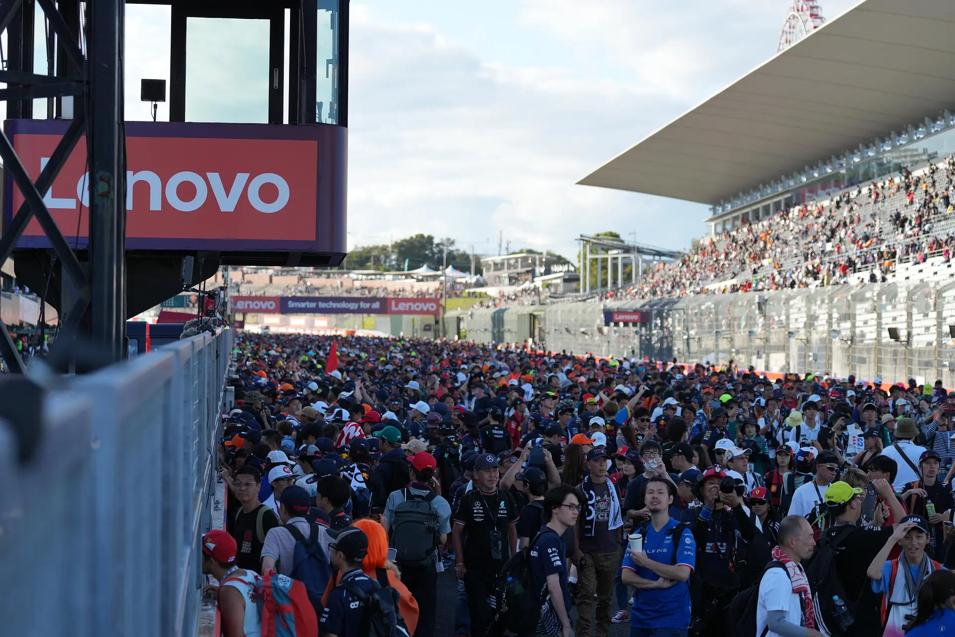 F1日本グランプリの始まりを告げる最初のイベント。ピットロードから、各チームが準備を進めるピットを見ることができます。