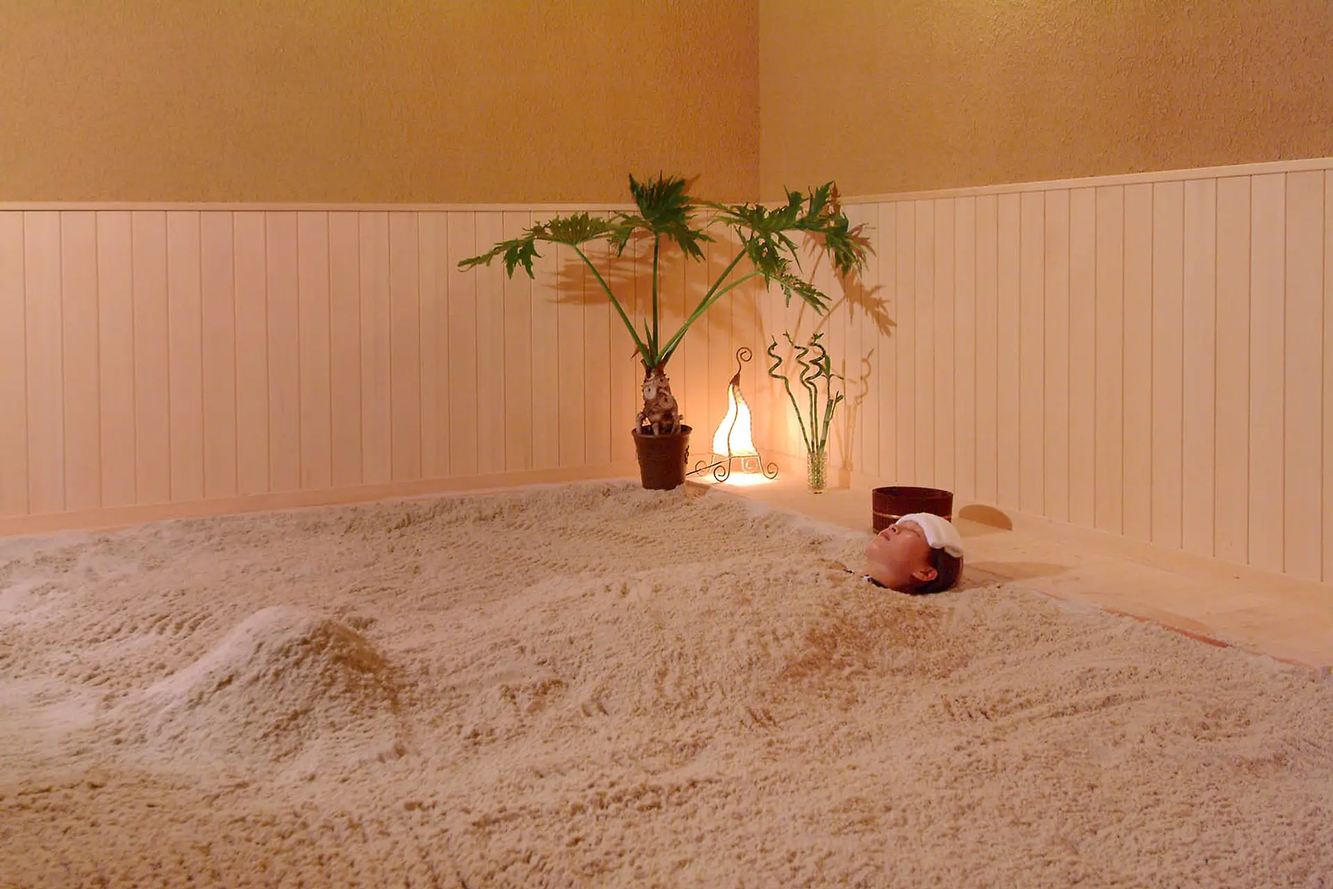 温熱の砂塩に包まれることで、血行と体液の流れを促進し、遠赤外線の働きで身体の芯までポカポカに温まります。
