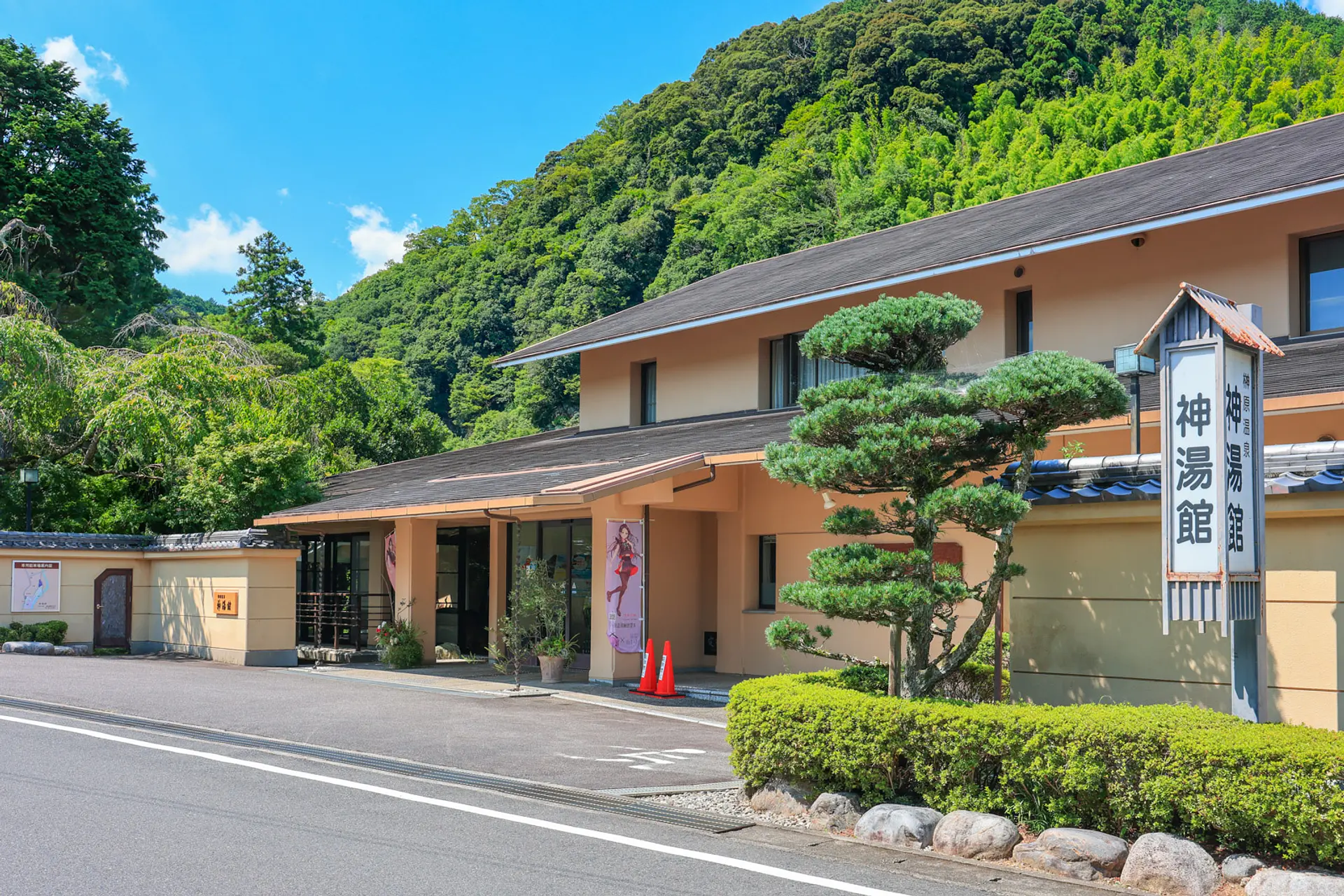 神湯館(しんとうかん)は日帰り温泉も楽しめる温泉宿で、静寂な森に包まれた環境に位置します。