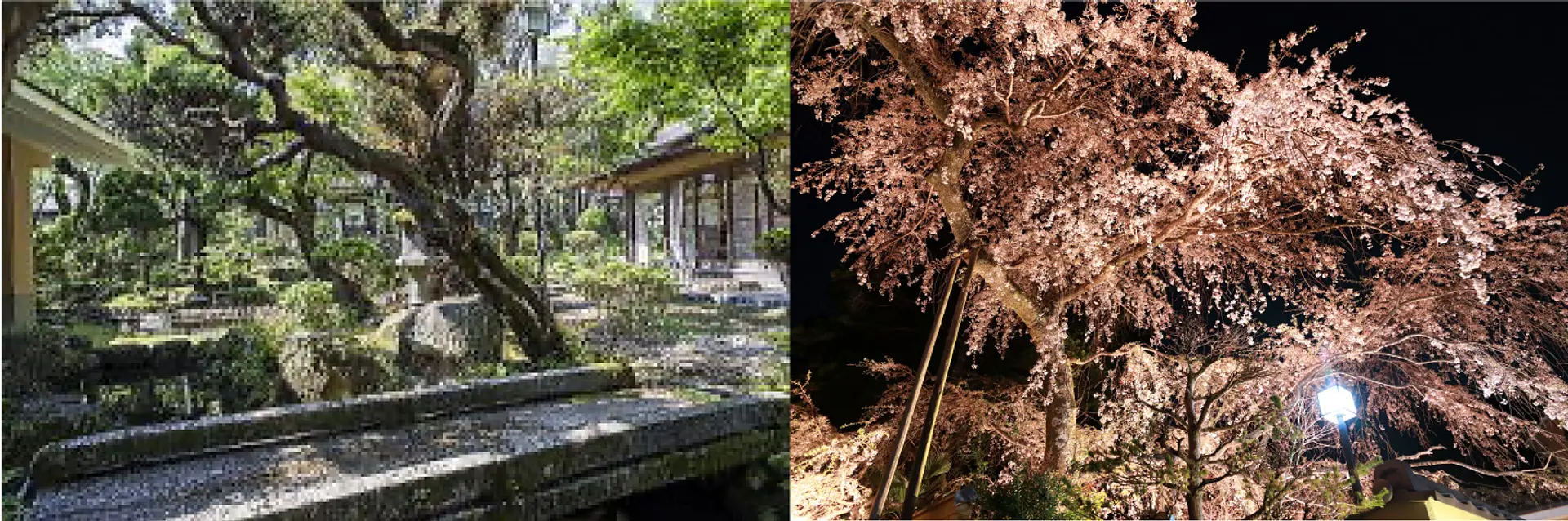 外観と内観は心落ち着く数寄屋造(すきやづくり)風の造りとなっており、入口には大きな枝垂れ桜が、客室からは美しい庭園と榊原川を眺められます。