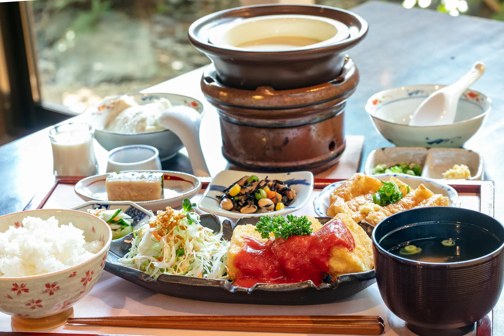 築100年の古民家を改築した豆腐料理店。旨味・栄養たっぷりで体に優しい大豆やお豆腐を生かした料理が味わえます。併設された工房では豆腐作り体験や物販もあります。