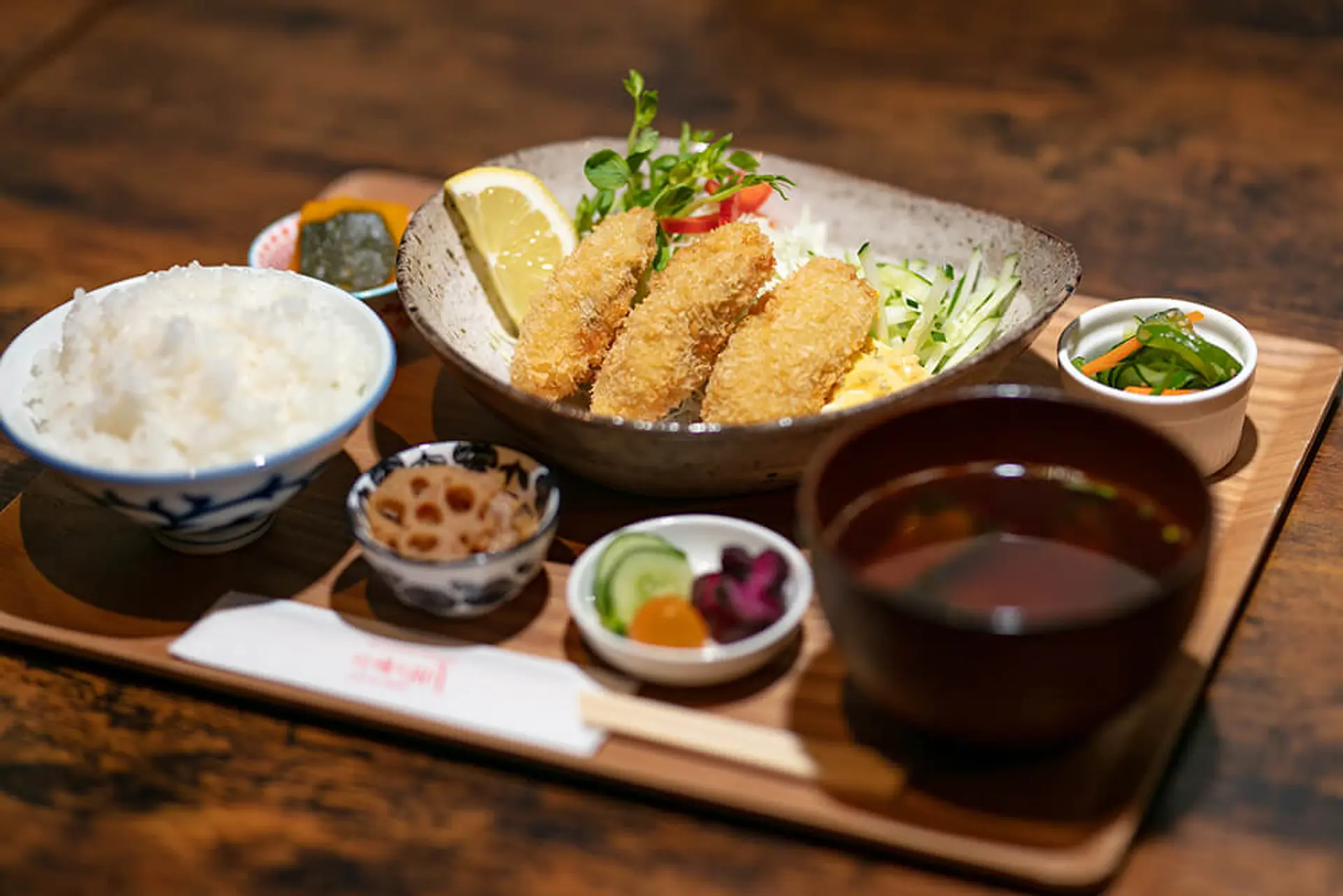 クーポン2枚利用で「カキフライランチセット(カキフライ三粒+御飯+お味噌汁+香の物)」 ※平日昼限定