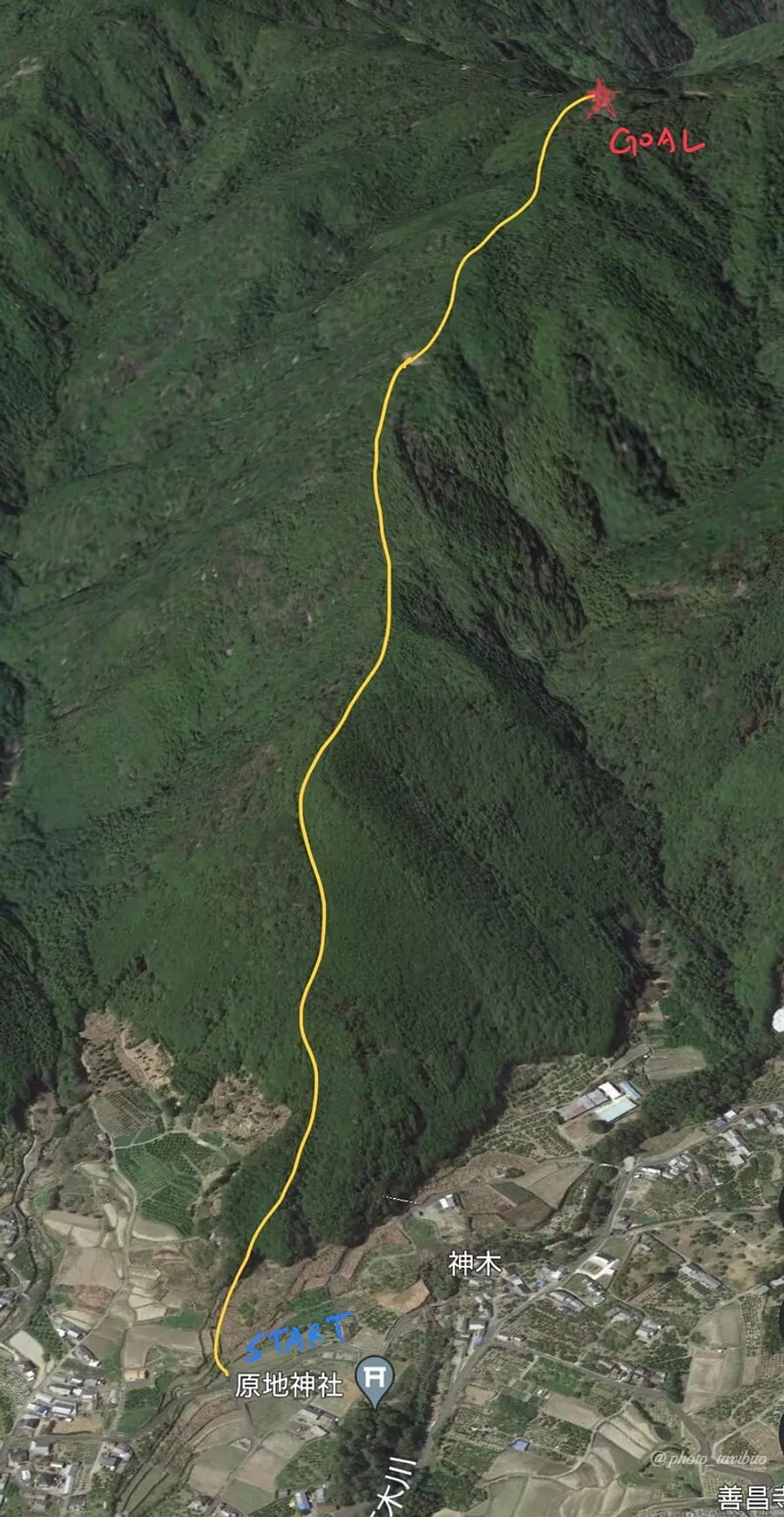 妙見山の登山口は、御浜町神木地域にある『原地神社』の近くにあるため、神社を目印に目的地をセットするといいと思います。
