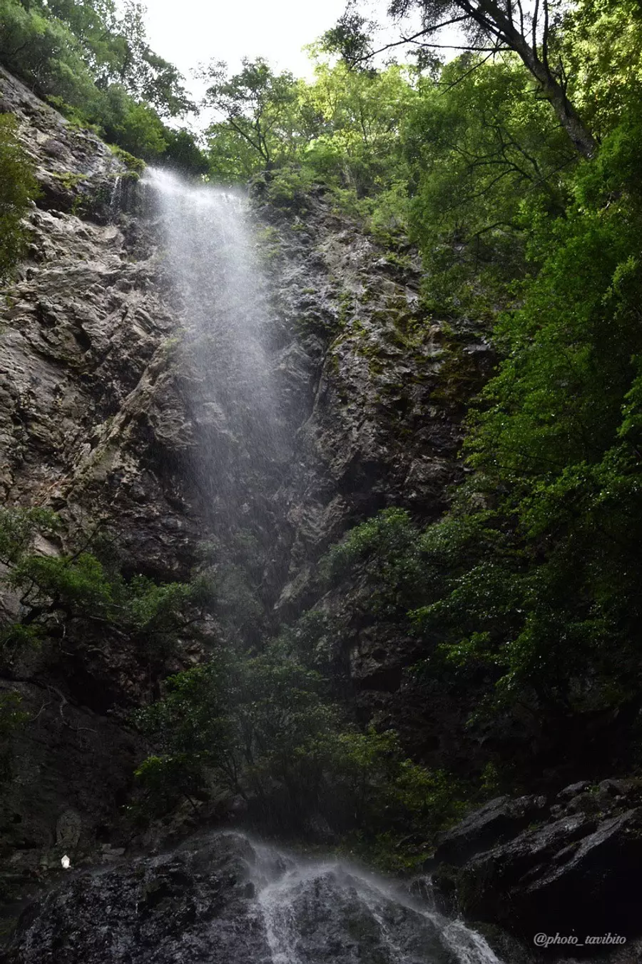 この滝の特徴として、滝つぼに水が流れ落ちるほど水量が多くないため、滝の下側がミスト状態になっている珍しい滝。
