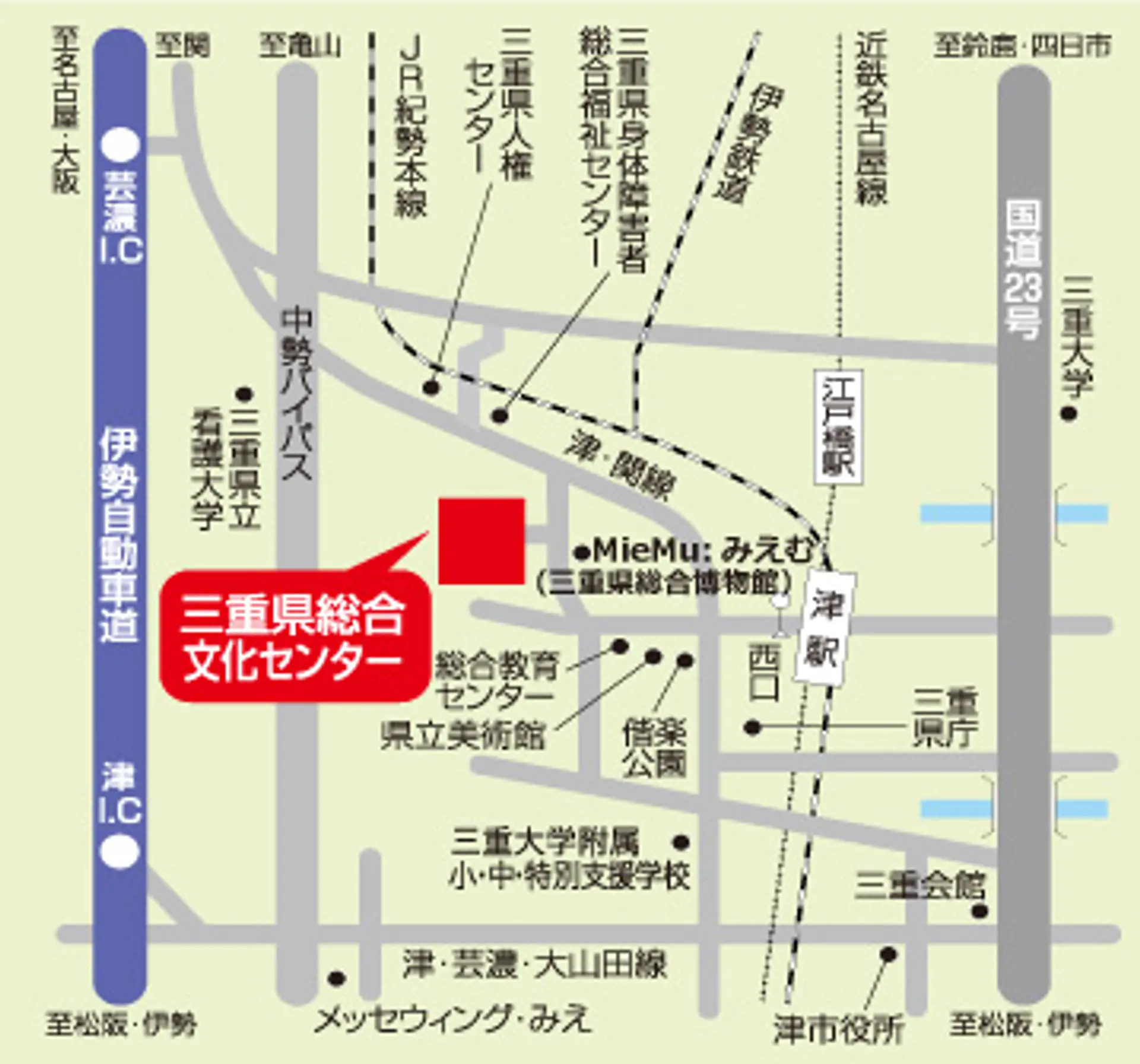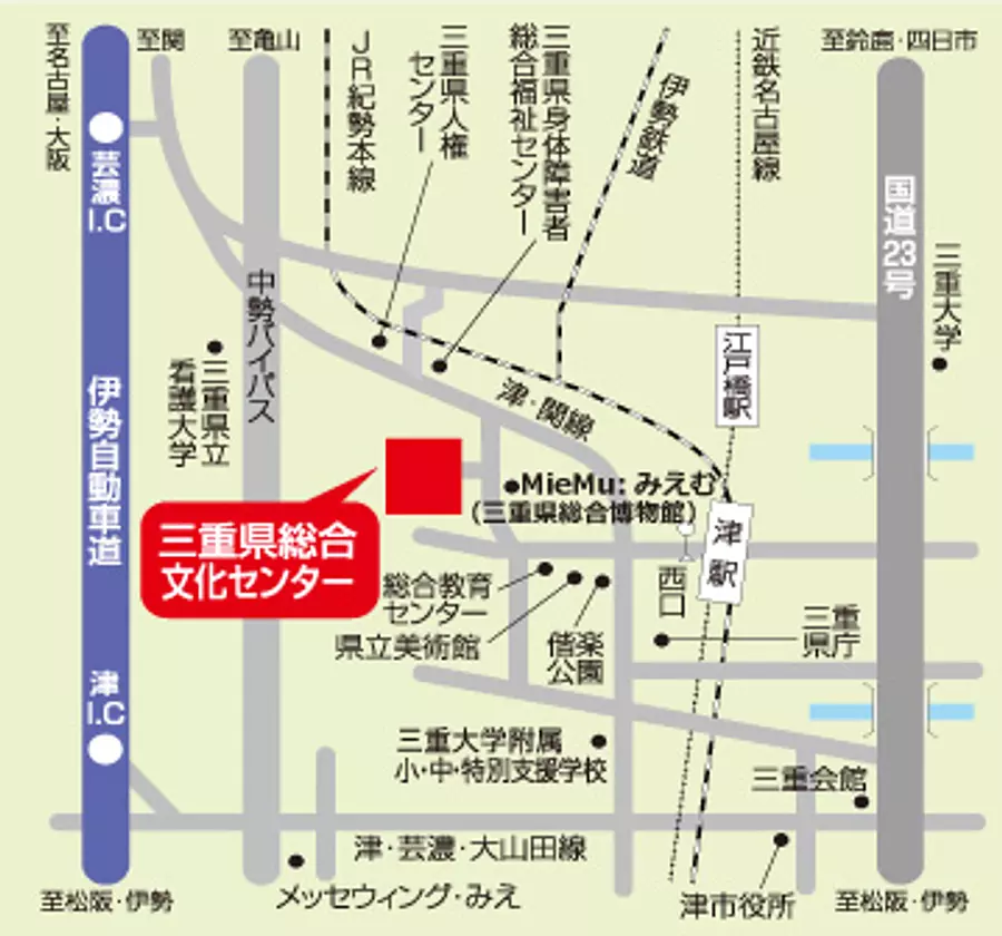 ・津駅から三重県総合文化センターまで徒歩1.8km、所要時間は約24分です。