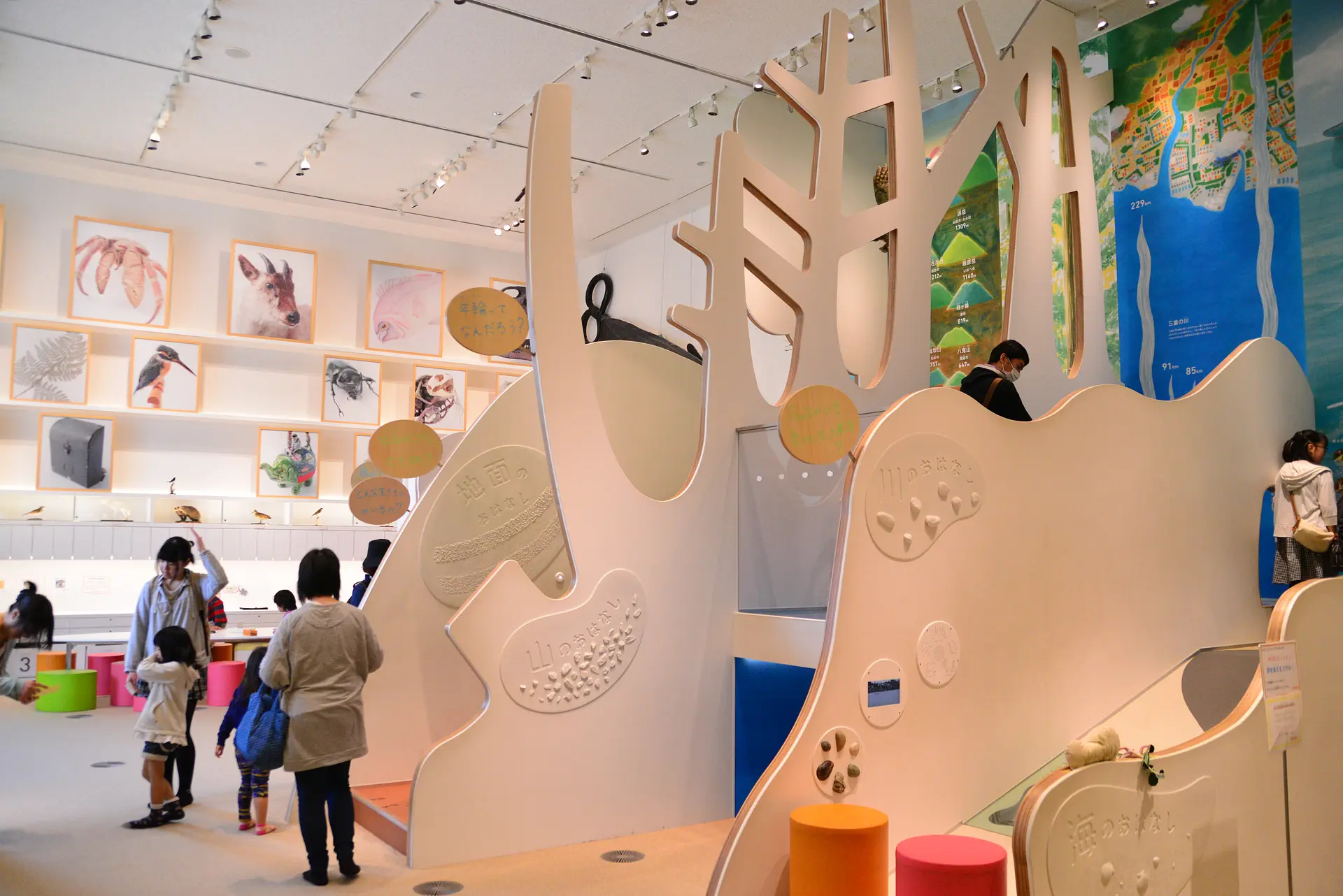 こちらはお子さまに大人気のエリア「こども体験展示室」です。小さなお子さん達が遊んで学べるエリアとなっています。幅広い年代の方が遊んで学んで楽しめる博物館となっております。まだ行った事が無い方はぜひ足をお運びください。