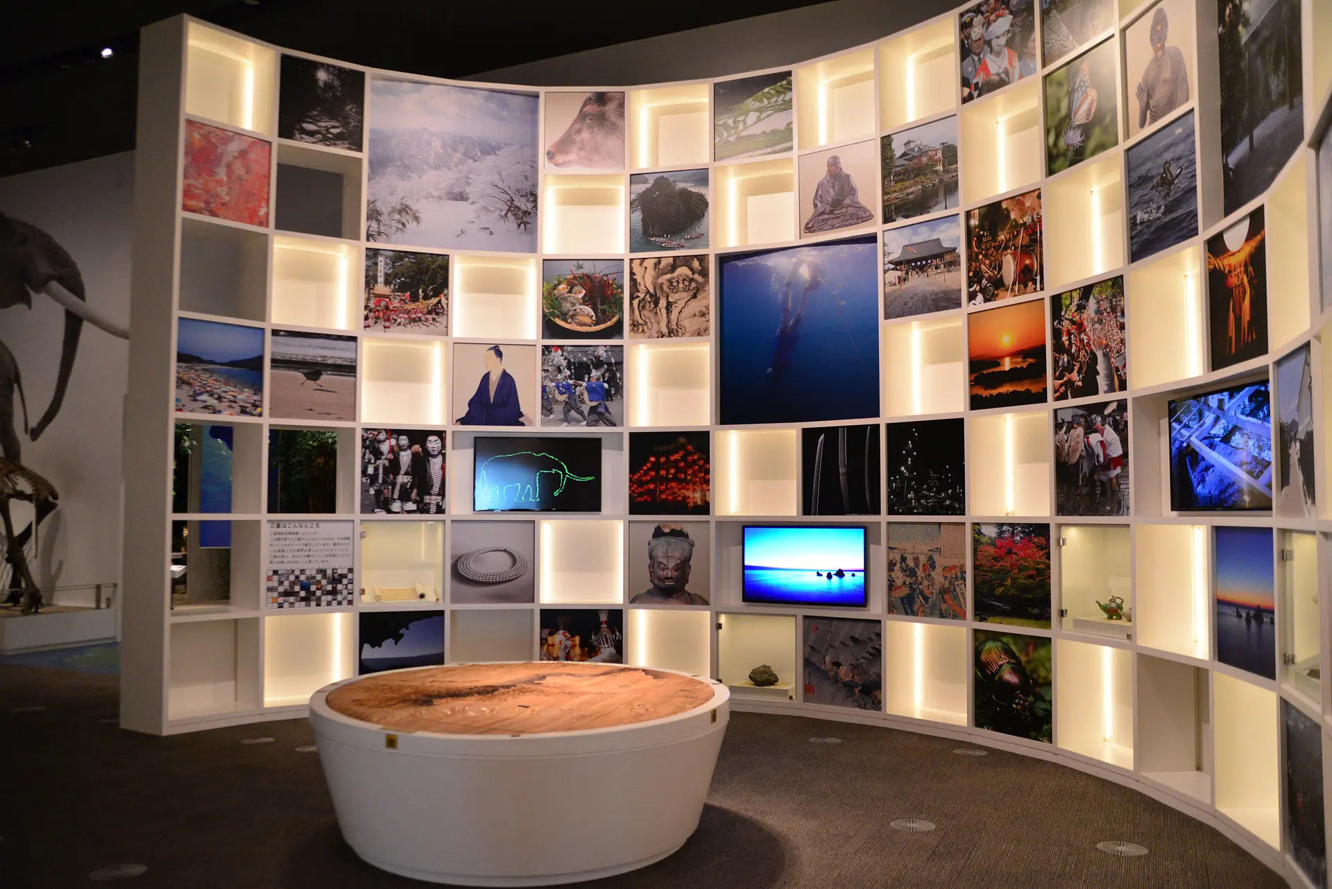 こちらは基本展示室から入ってすぐのエリアです。三重県内の文化、歴史、自然を写真でわかりやすく展示しています。