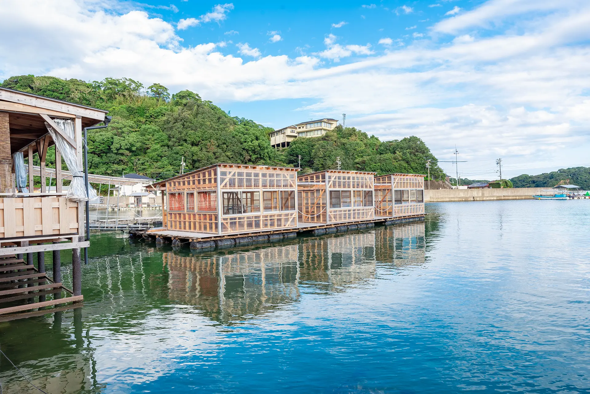 なんと海の上に牡蠣小屋風の建物が浮かんでいます!