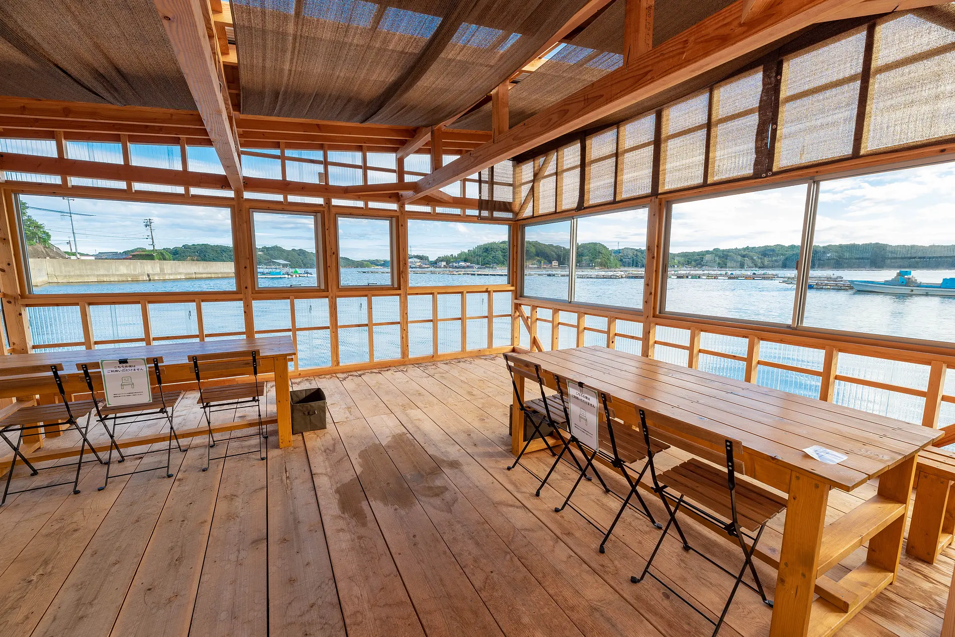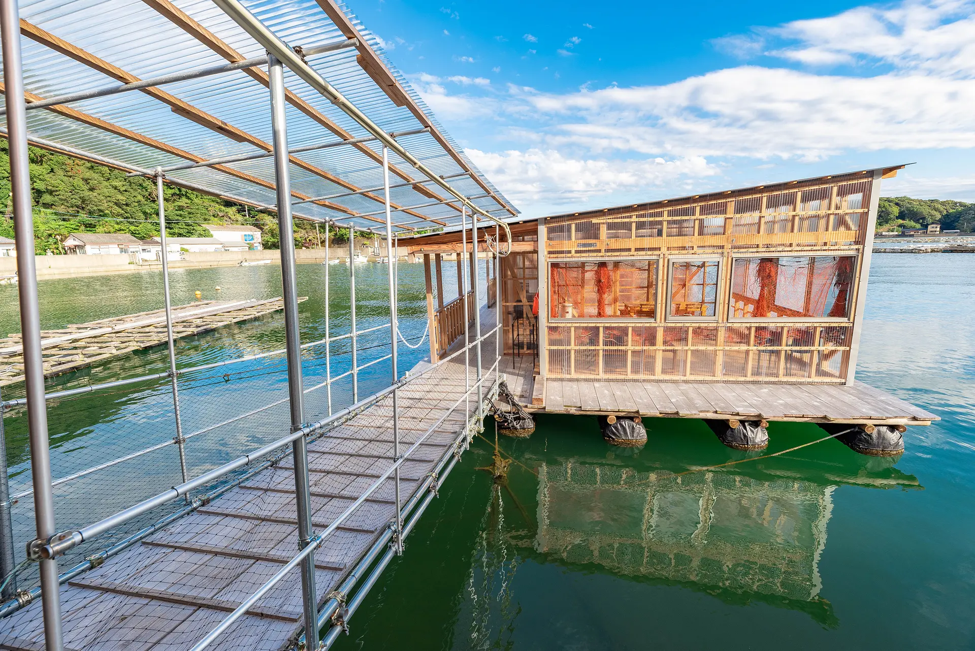 木と透明の波板で作られた海上桟橋にある客席からは、湾内を行き来する船や牡蠣養殖の作業の様子が眺められ、自分が牡蠣養殖の現場にいることを身をもって実感できます。