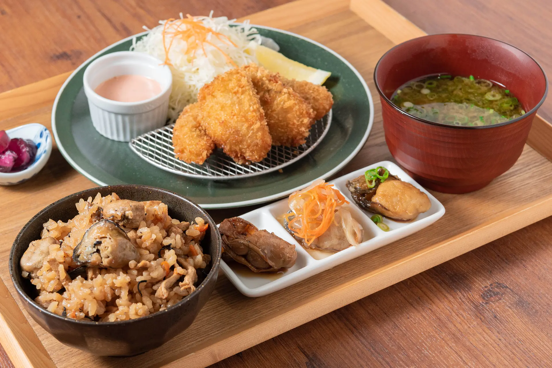続いて、カキフライ、牡蠣ご飯、3種のアラカルト、あおさの味噌汁が、定食形式でひとつのトレイに盛り付けられて提供されます。