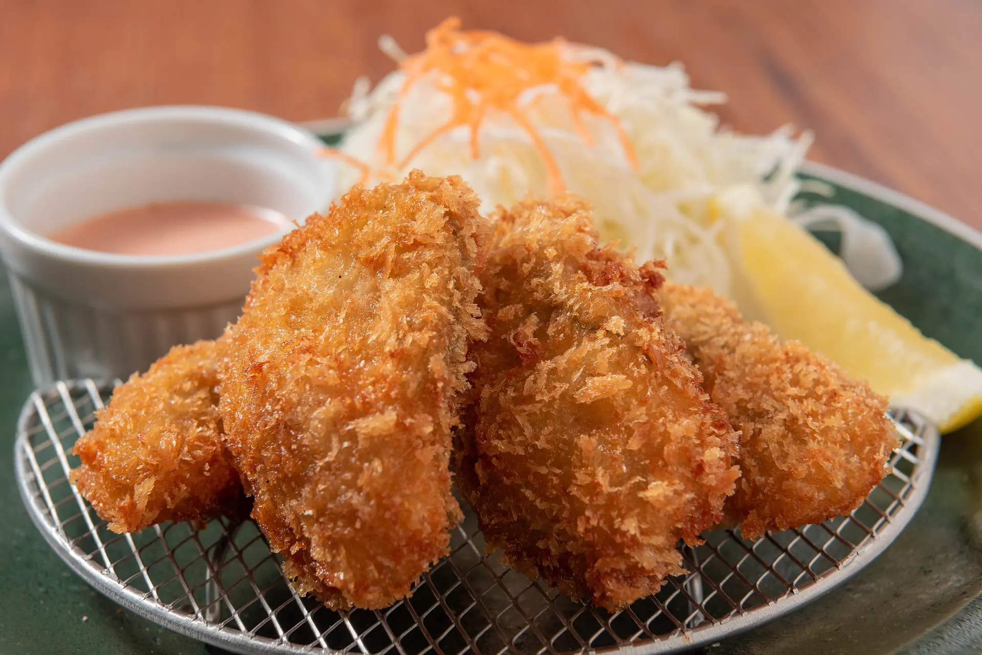薄めの衣に包まれた牡蠣は、アツアツのエキスが身の中にぱんぱんに詰まっていて、噛むとじゅわっとおいしさが広がります。
