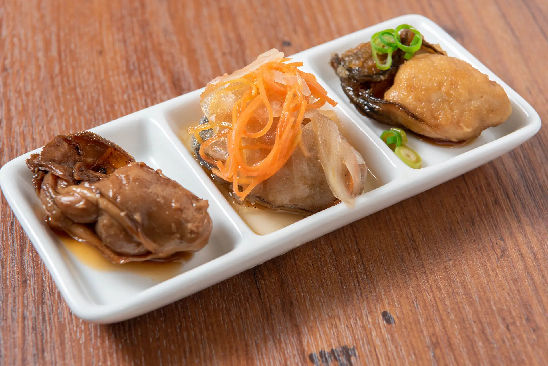 そして、手前に並んでいるのが「3種のアラカルト」。画像左から、牡蠣のつくだ煮、南蛮漬け、甘たれ唐揚げの3種。