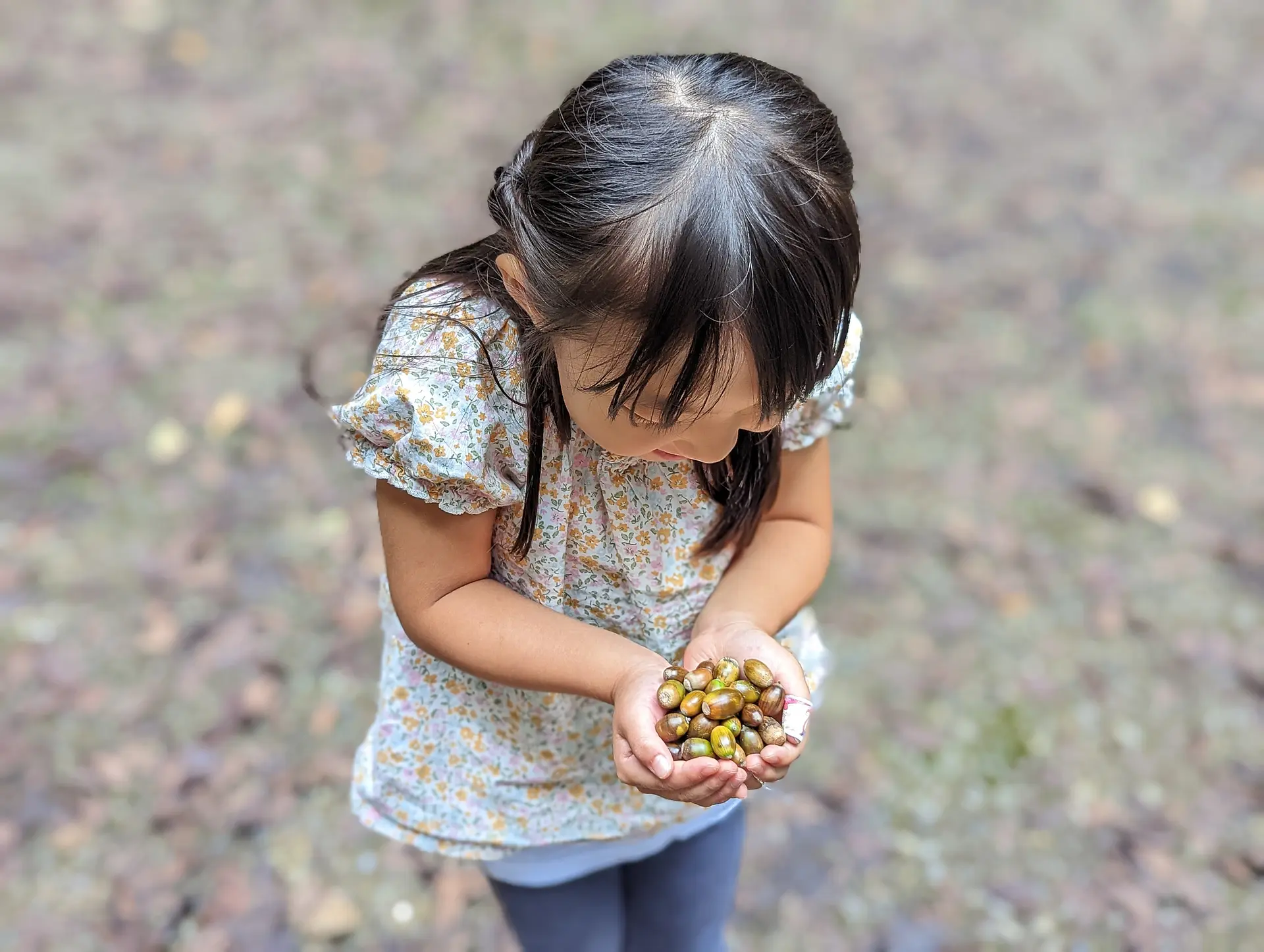 途中、娘が全然進まなくなってきたと思い、動かない娘の様子を確認しに行くと、熱心にドングリを拾い集めていました。