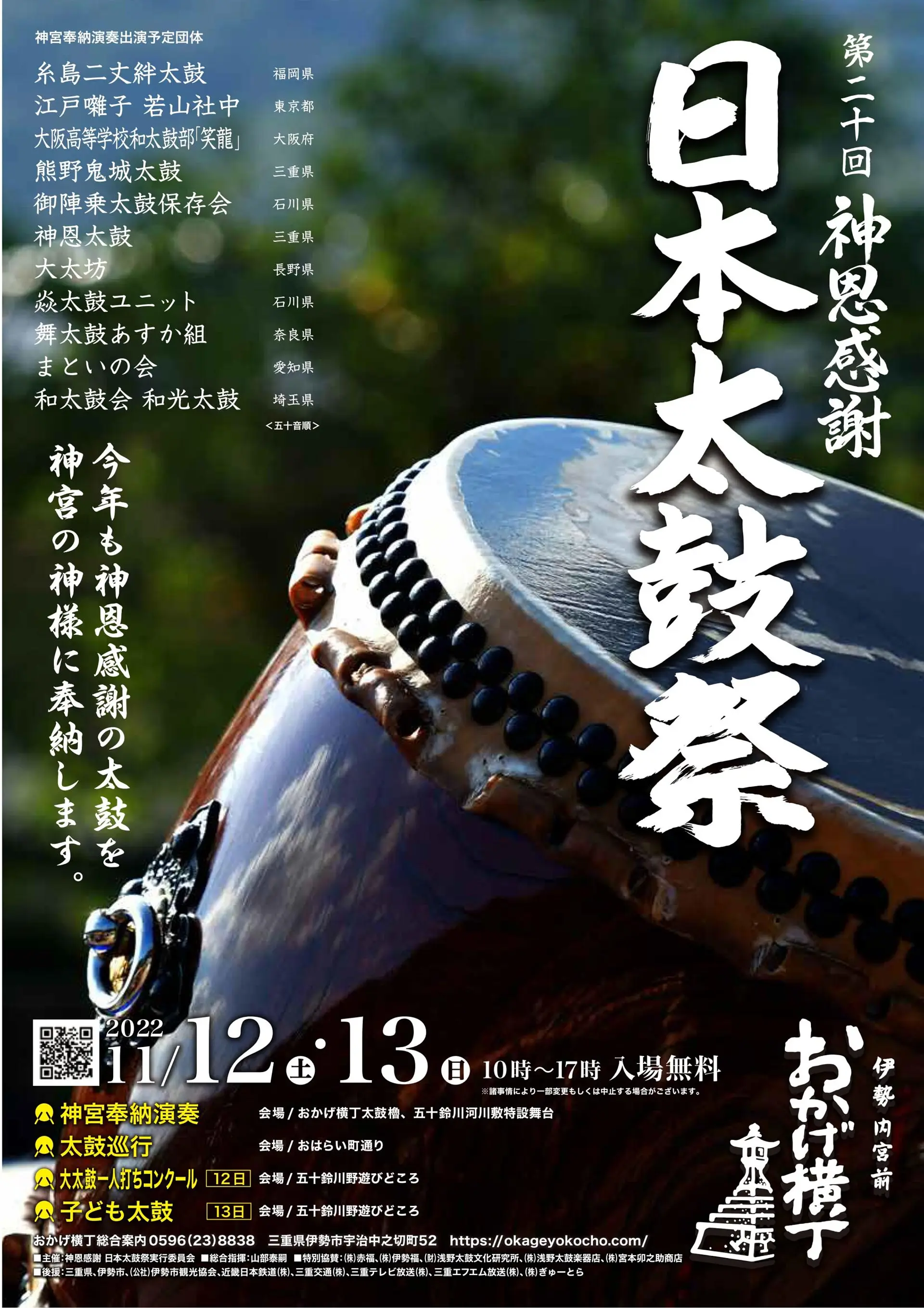 20回を迎える今回は、11年ぶりにおはらい町の太鼓巡行が復活するほか、大太鼓一人打ちコンクールや地域の子供たちによる演奏披露など、新たな催しが予定されています。